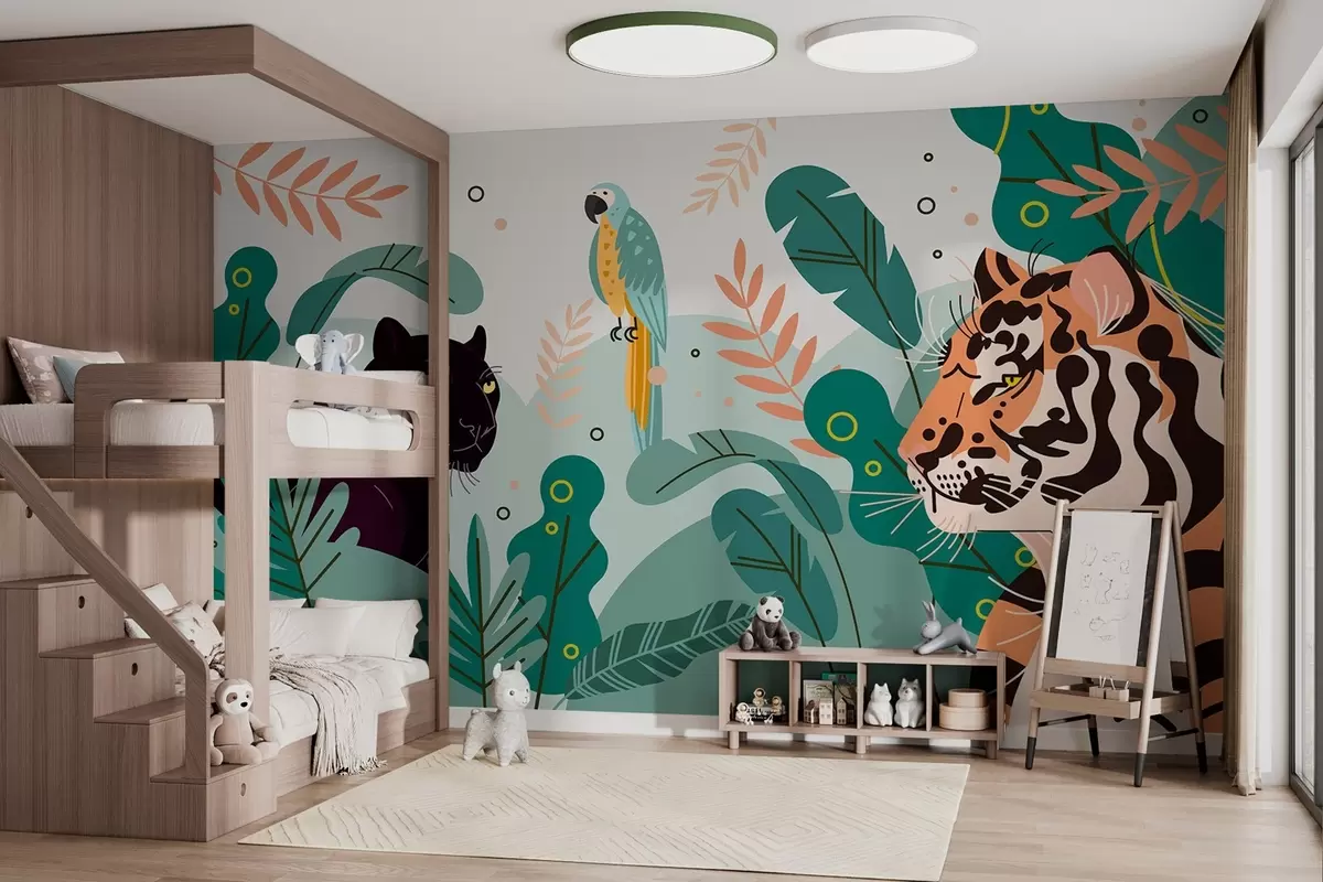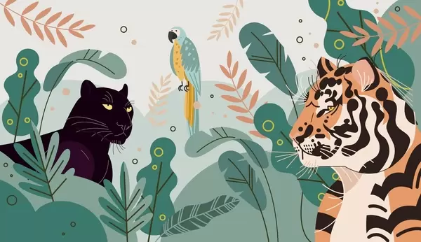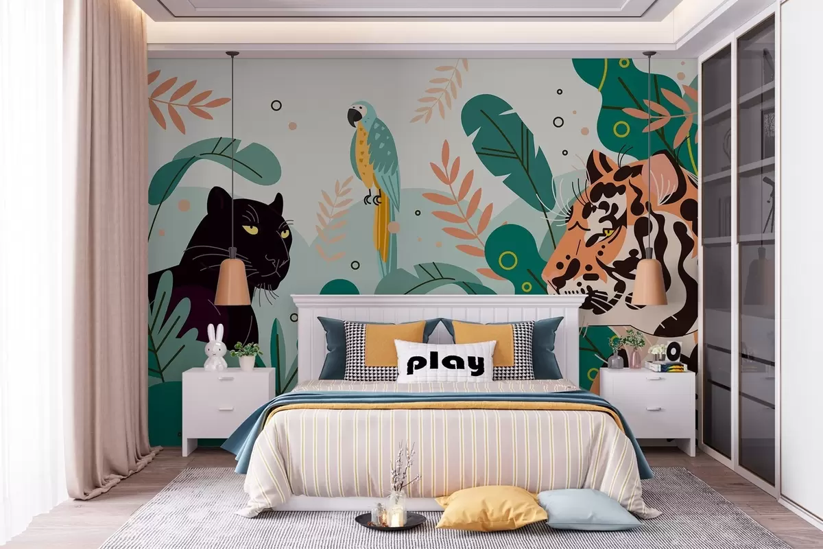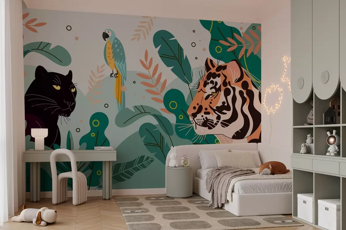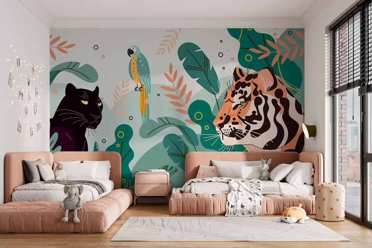 Zidne murale džungla s tigrom, panterom i papigom br. w03958