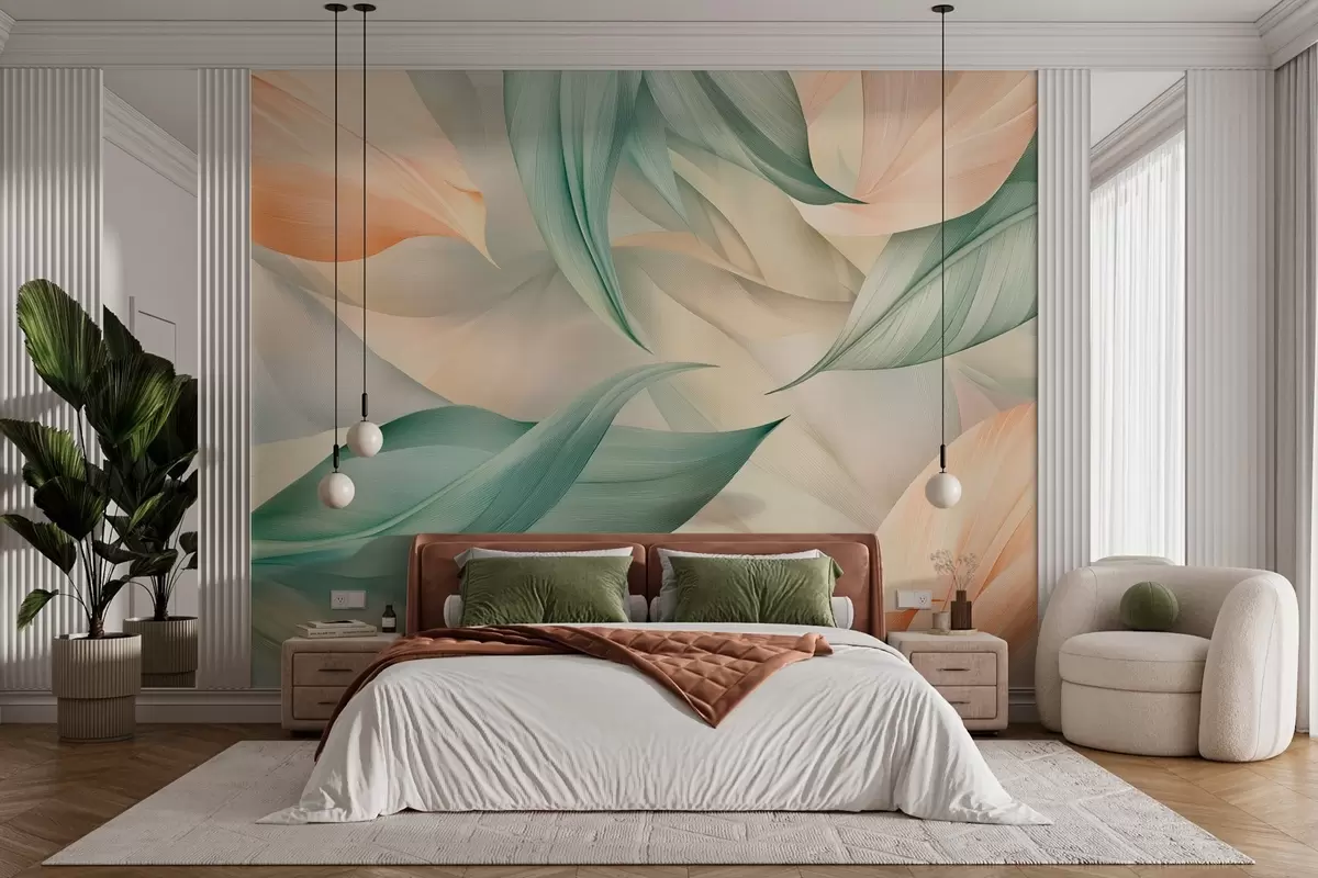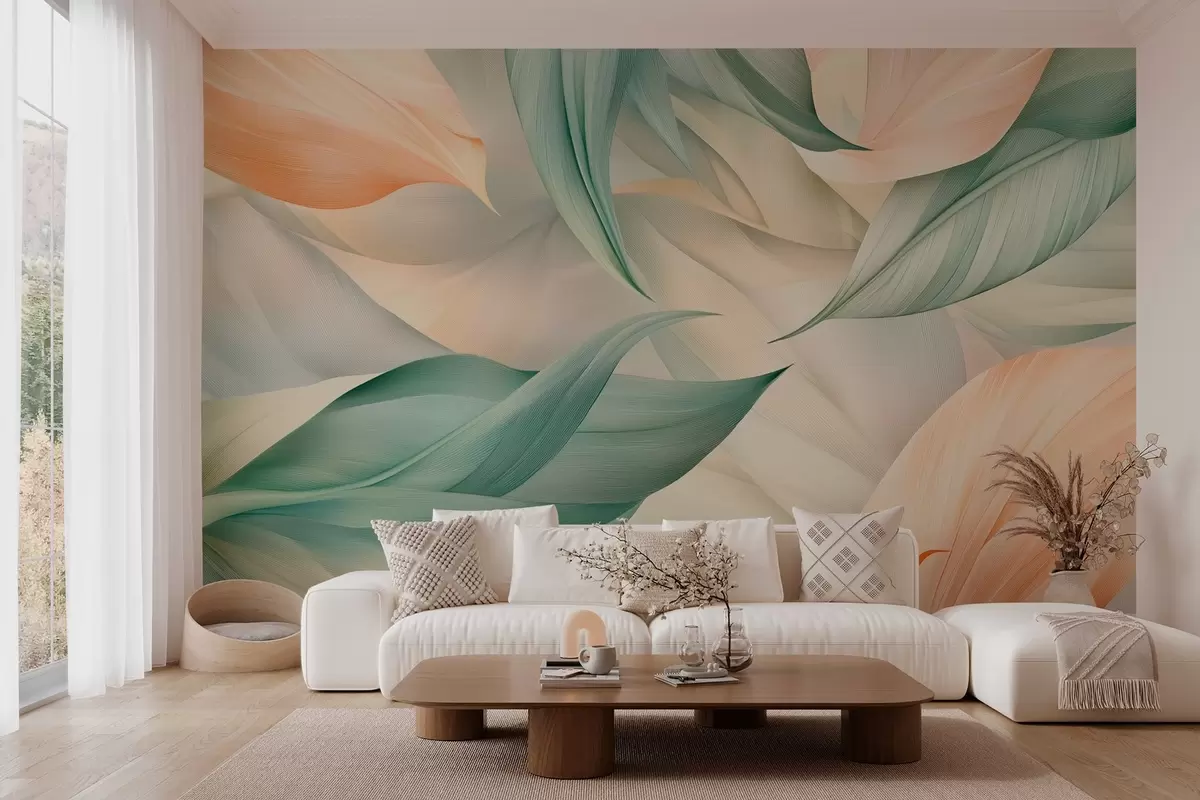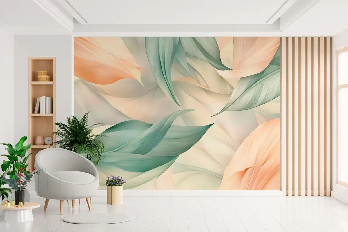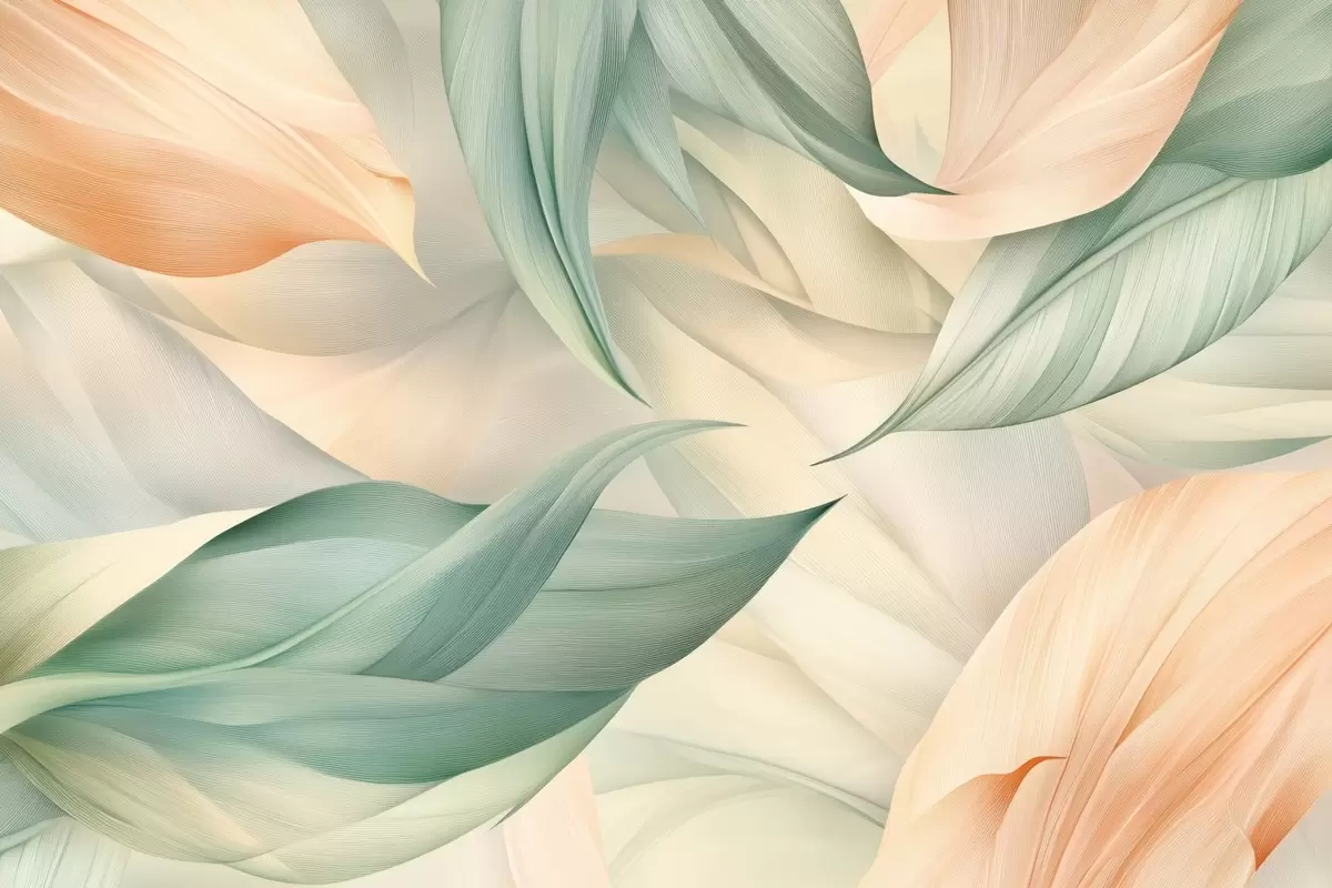 Zidne murale egzotično tropsko lišće u nježnim tonovima breskve i zelene br. w03962