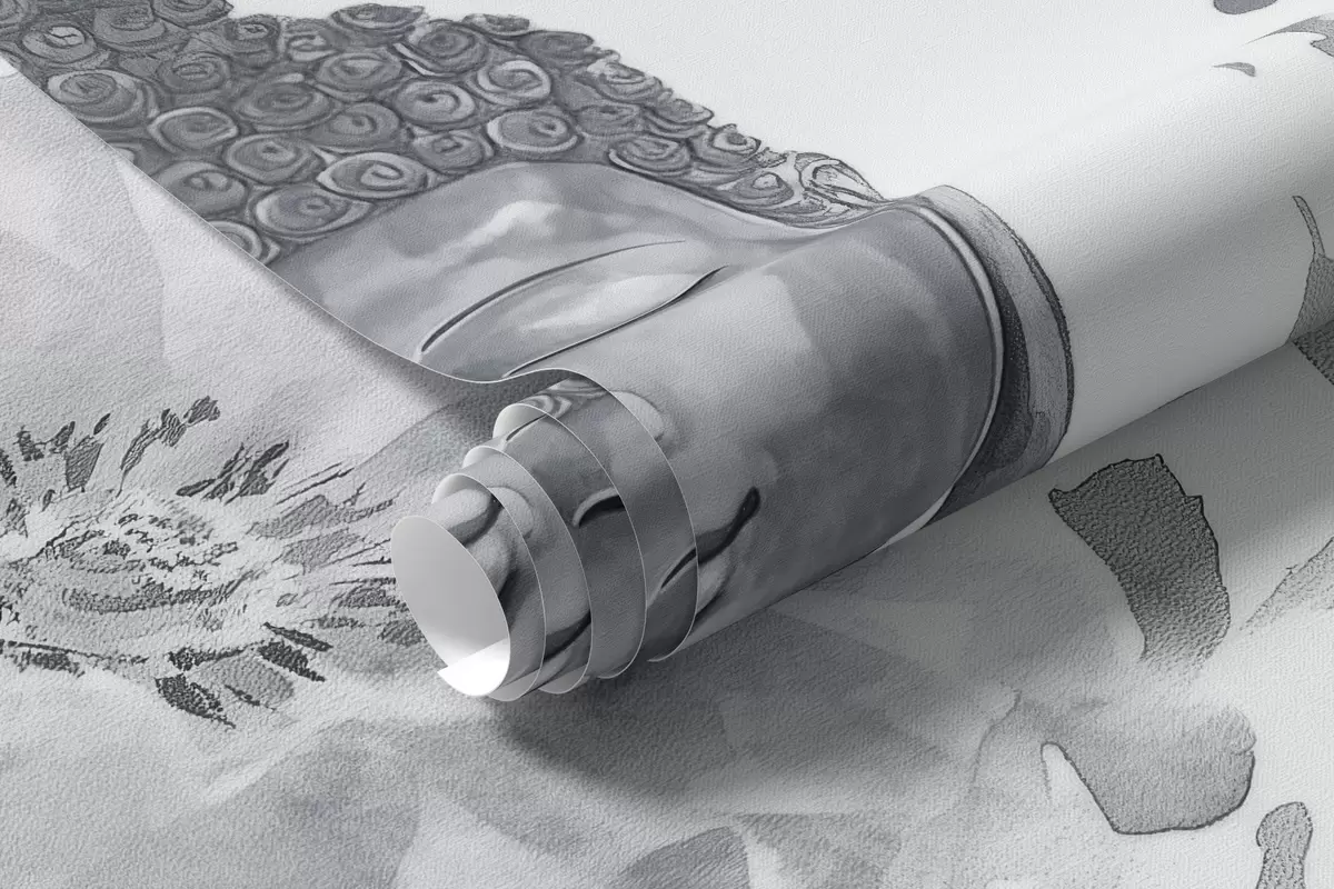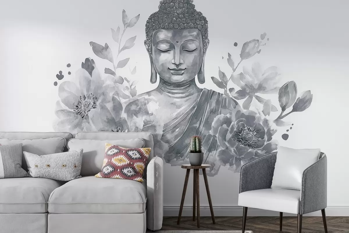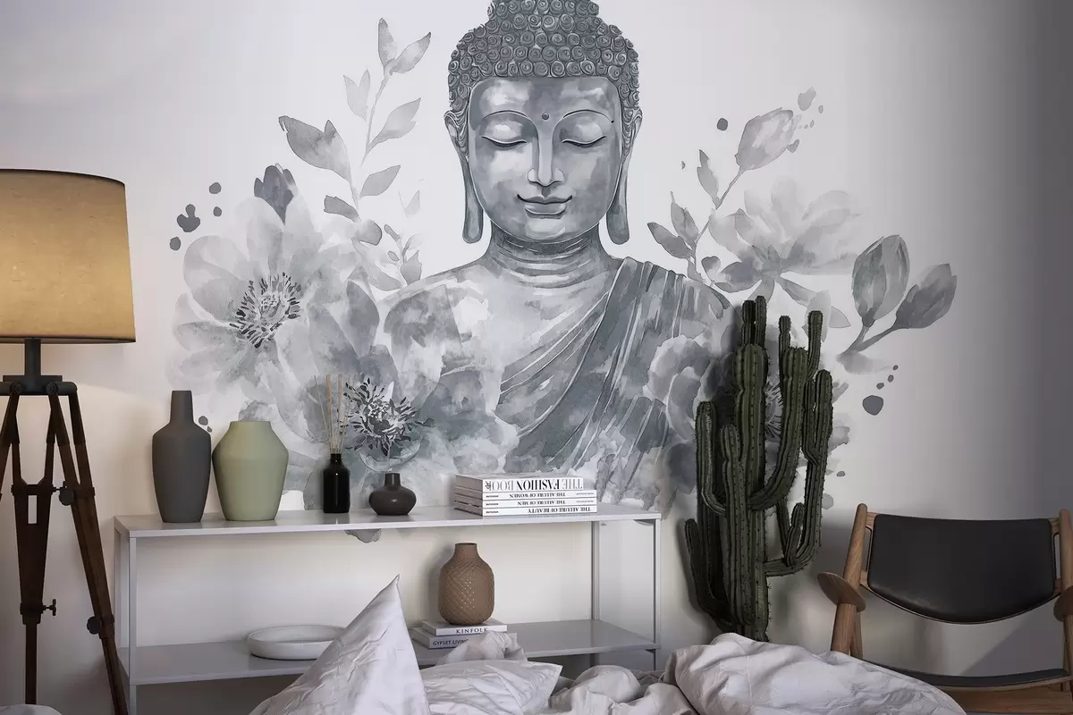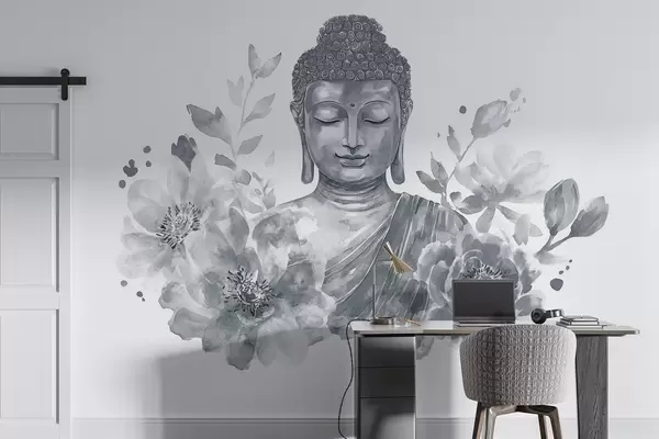 Zidne murale Akvarel Buda s cvijećem, duhovna, siva paleta boja br. w04005v1