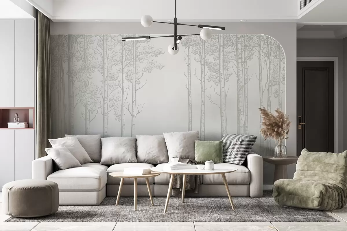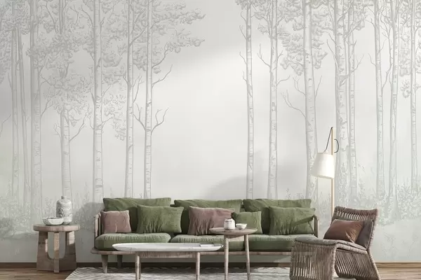 Zidne murale Šuma s brezama, minimalizam, priroda, zelena paleta boja br. w04009v1