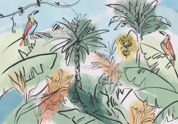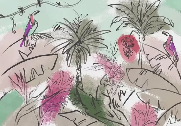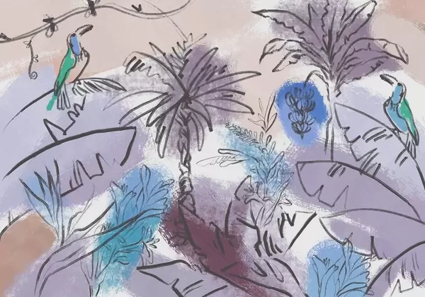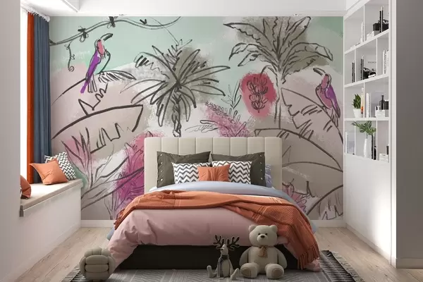 Zidne murale Tropski print s ružičastim cvijećem, egzotičnim papigama br. w04019v1