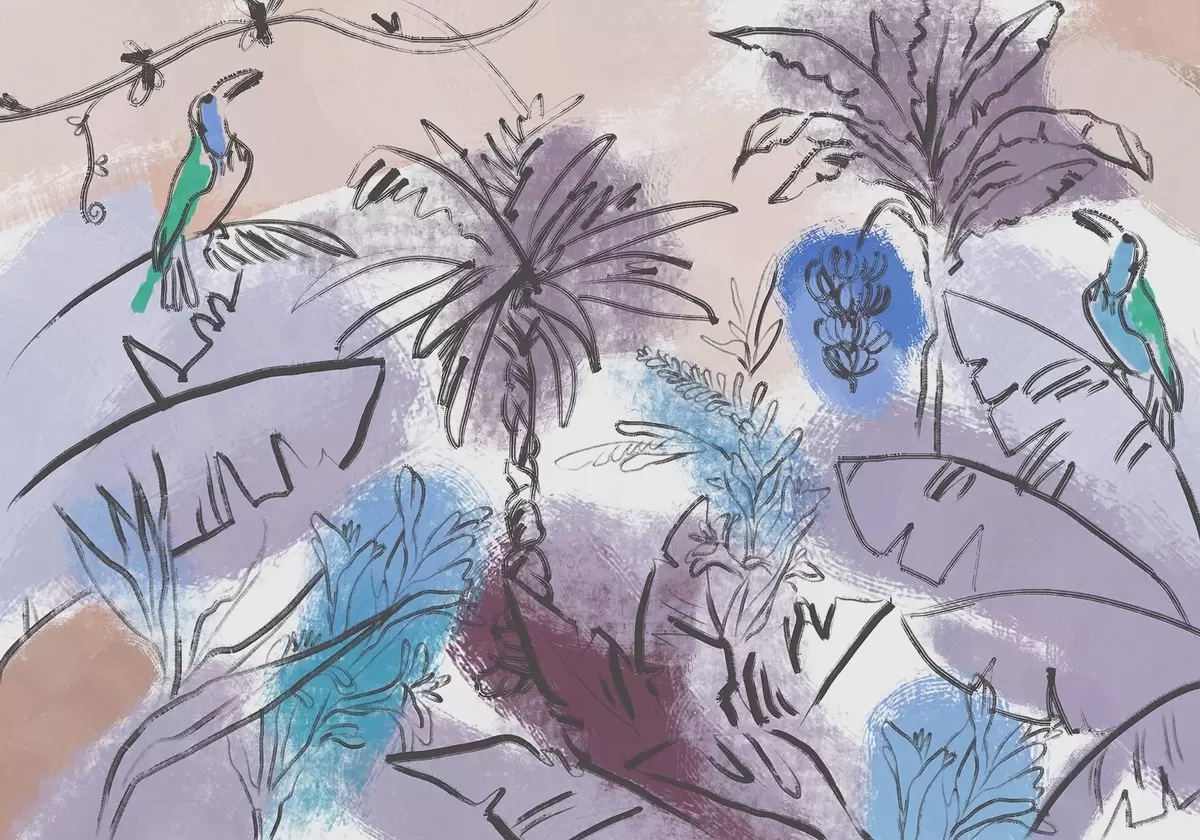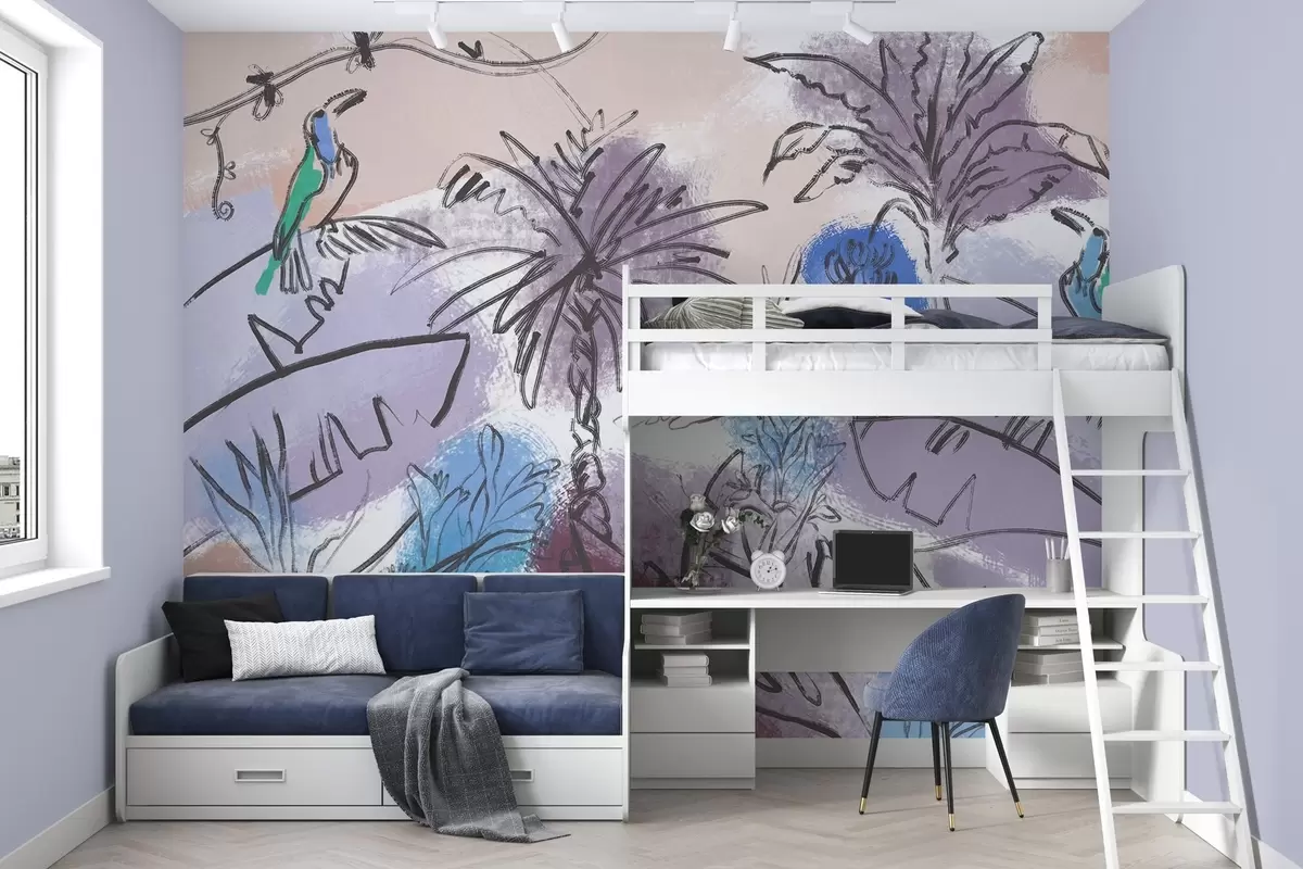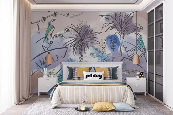 Zidne murale Tropski print s plavim cvijećem, slikoviti papige br. w04019v2