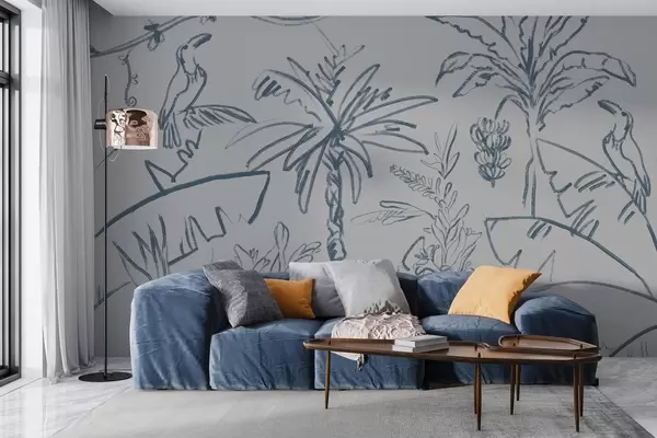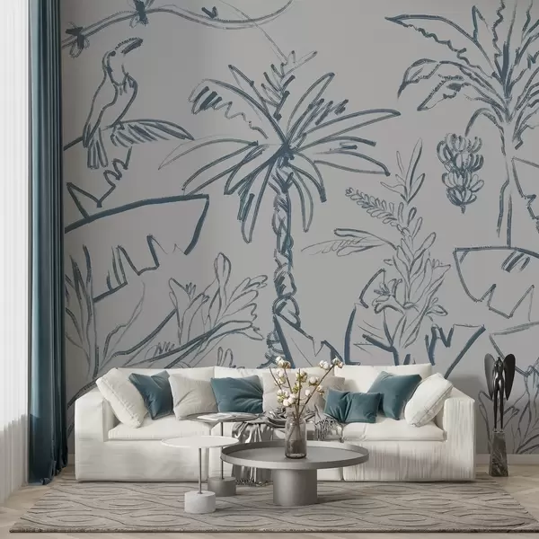 Zidne murale Tropski uzorak u plavoj boji, banane, palme br. w04020v1