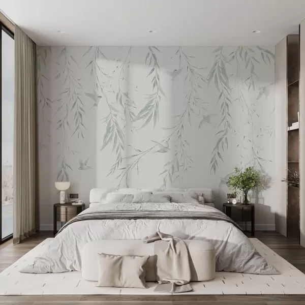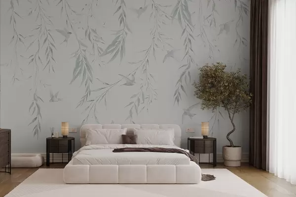 Zidne murale Grančice s visećim zelenim lišćem i ptice br. w04052