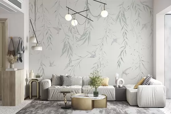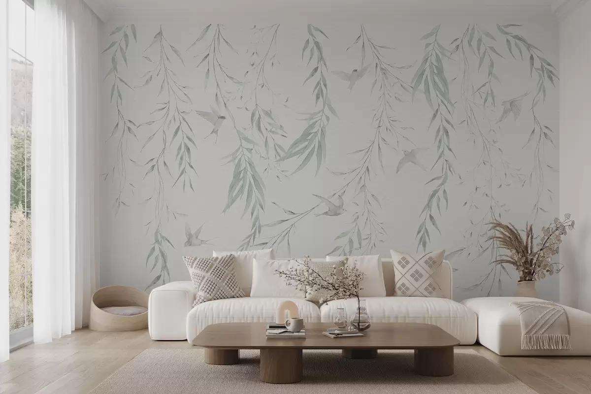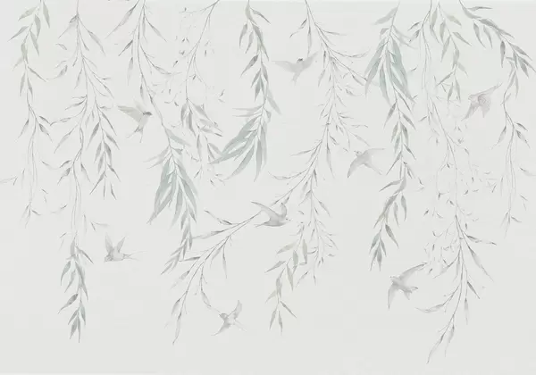 Zidne murale Grančice s visećim zelenim lišćem i ptice br. w04052
