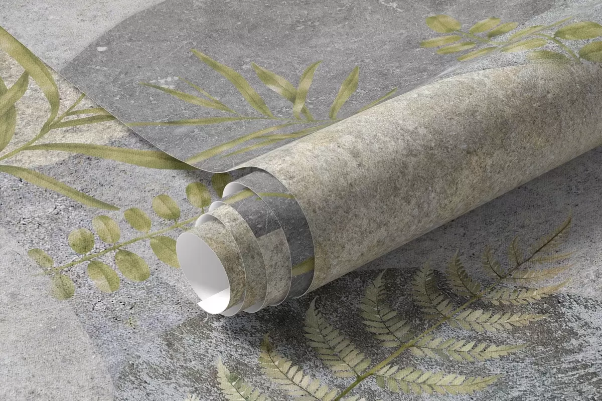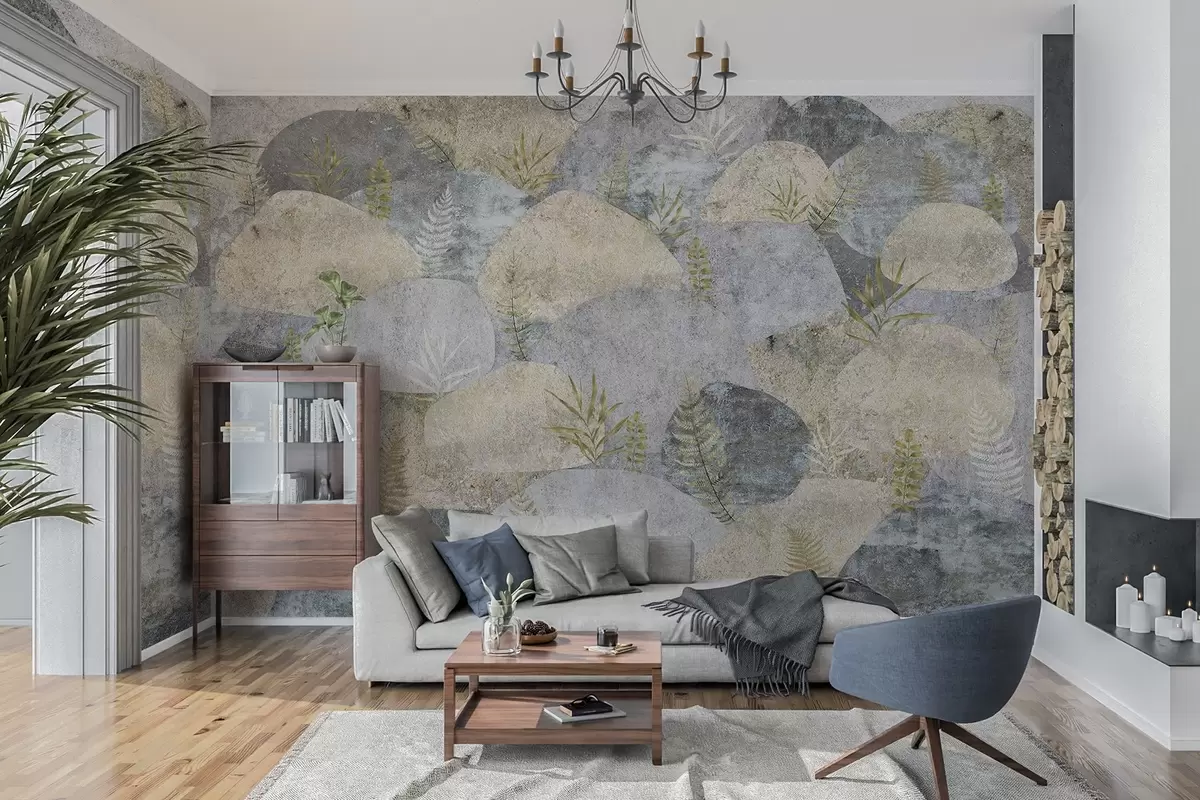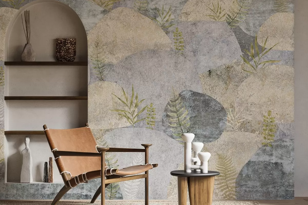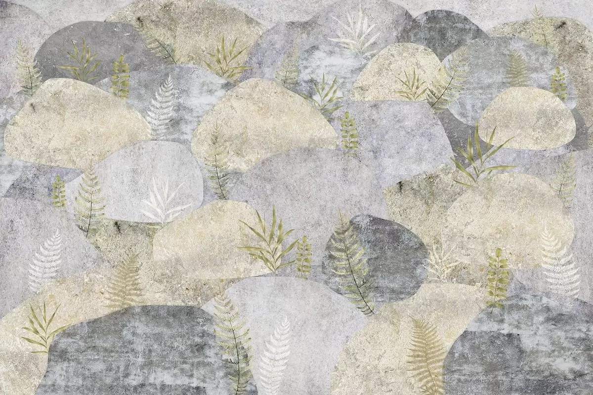 Zidne murale Kamenje s biljkama, paprat, nordijski, rustikalni stil, sive i pješčane boje br. w04064