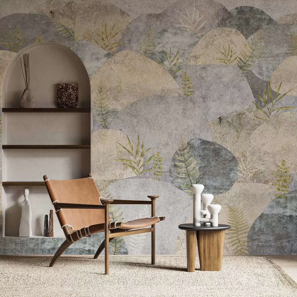 Zidne murale Kamenje s biljkama, paprat, nordijski, rustikalni stil, sive i pješčane boje br. w04064