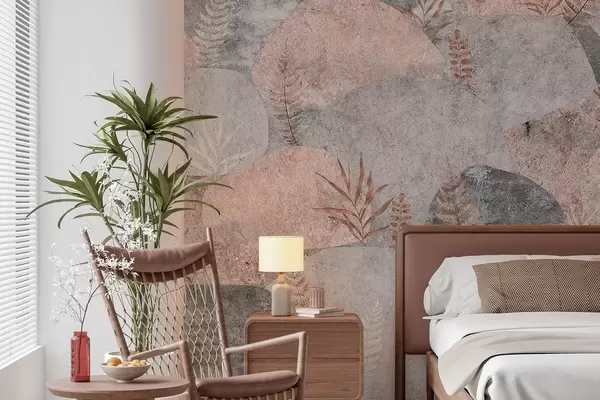 zidne murale Kamenje s biljkama, paprat, nordijski, rustikalni stil, sive i ružičaste boje w04064v1