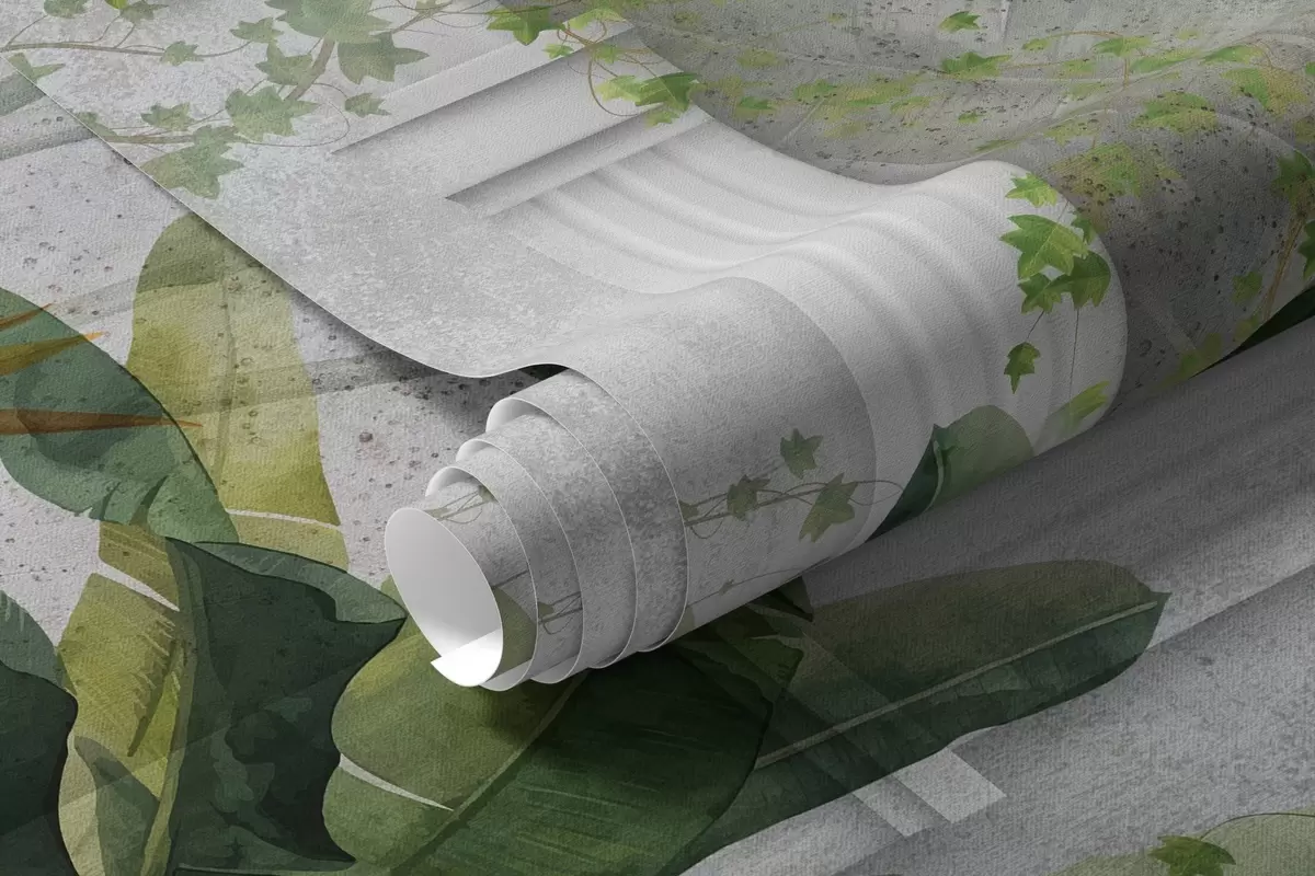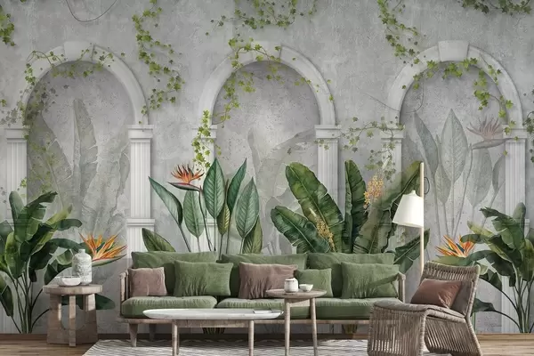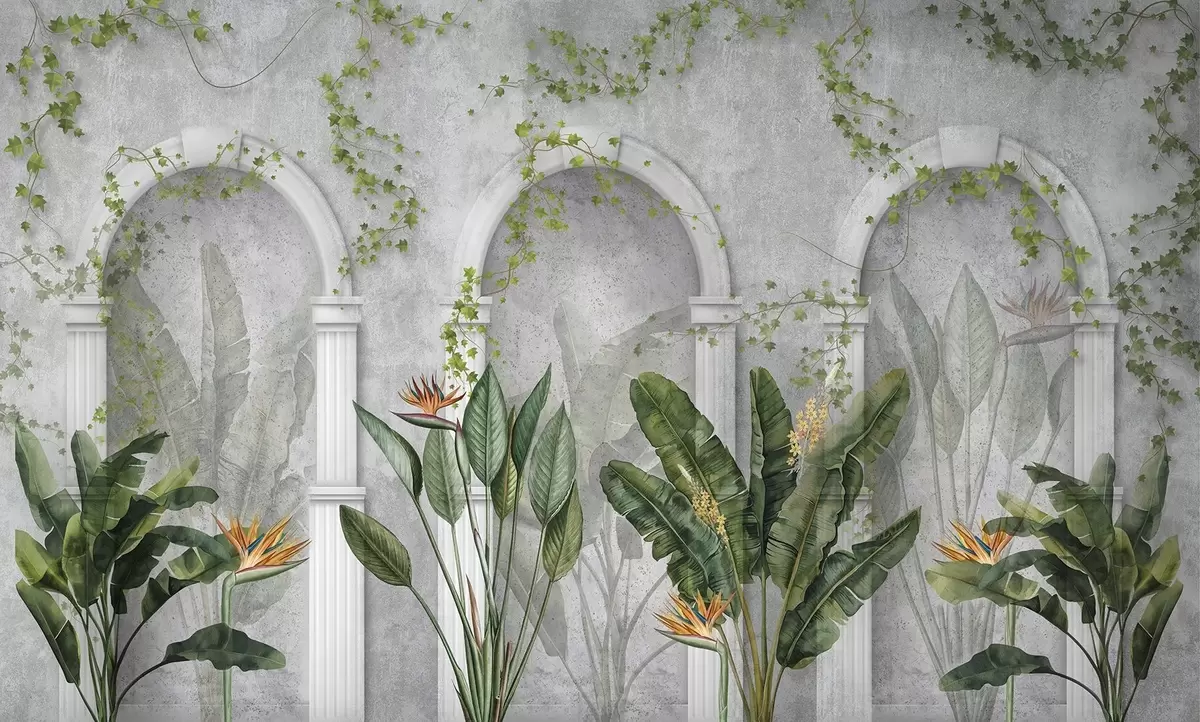 Zidne murale Betonski zid s lukovima i tropskim biljkama, cvjetnim, prirodnim bojama br. w04065