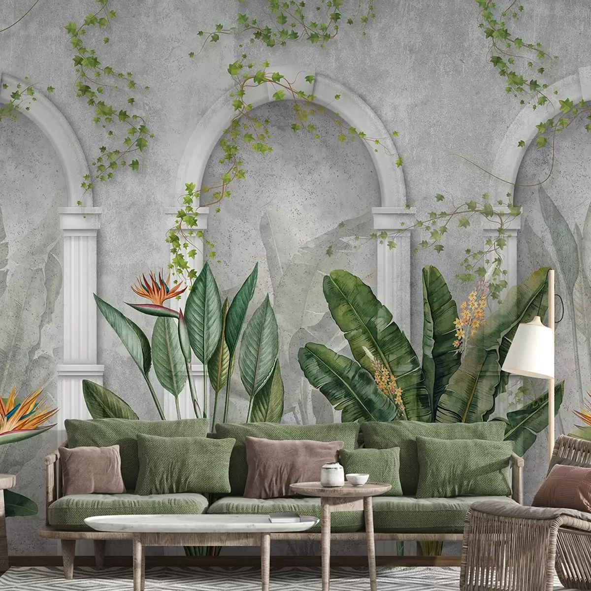 Zidne murale Betonski zid s lukovima i tropskim biljkama, cvjetnim, prirodnim bojama br. w04065