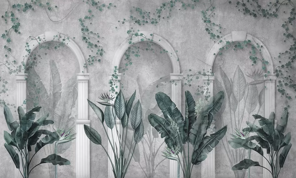 zidne murale Betonski zid s lukovima i tropskim biljkama, cvjetnim, plavim bojama w04065v2