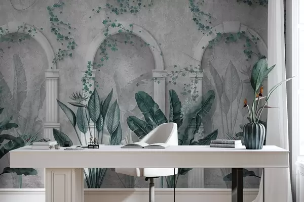 Zidne murale Betonski zid s lukovima i tropskim biljkama, cvjetnim, plavim bojama br. w04065v2