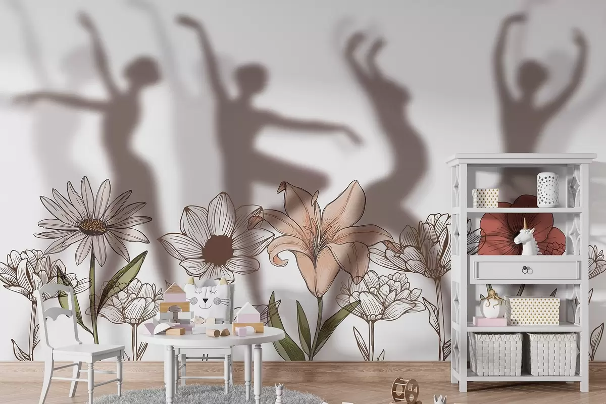 Zidne murale Siluete balerina, rustikalno cvijeće, linijska umjetnost, crvene i bež boje br. w04069