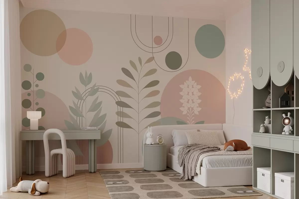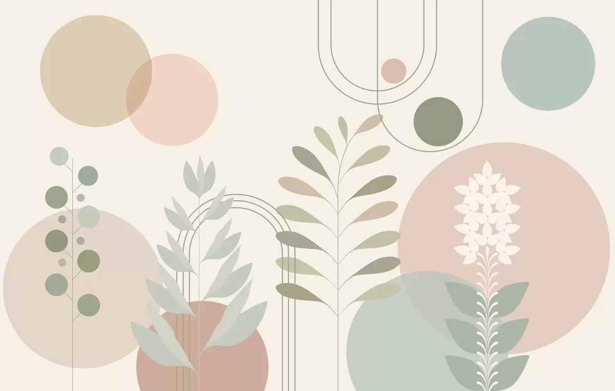 Zidne murale geometrijska apstrakcija s krugovima i stiliziranim biljkama na krem pozadini br. w04070