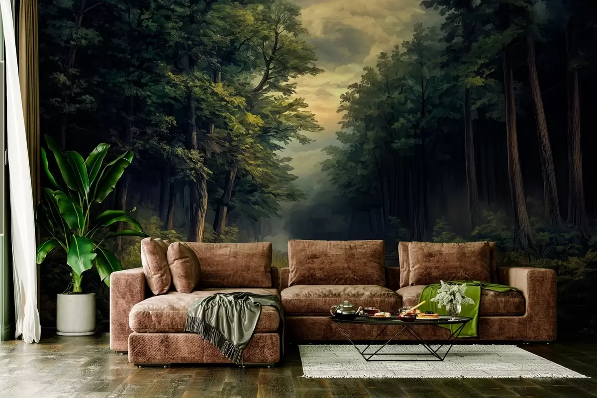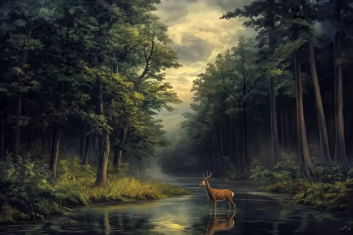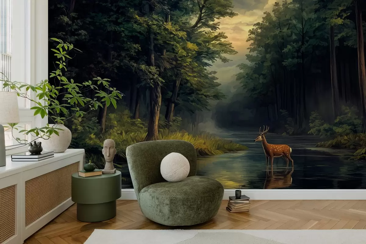 Zidne murale Šuma s jelenima i rijekom u stilu nizozemskog uljanog slikarstva br. w04072