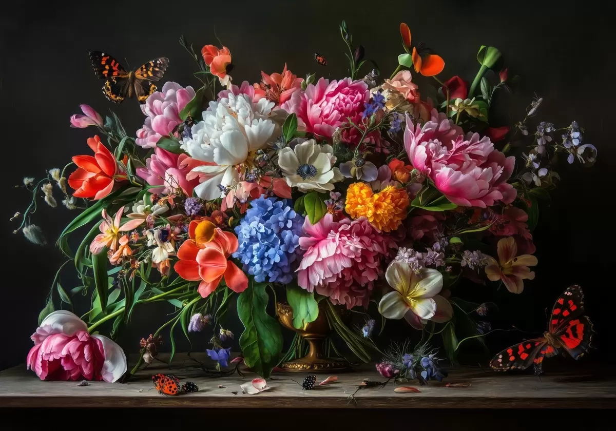 Zidne murale Buket u stilu nizozemskog uljanog slikarstva XVII stoljeća s luksuznom cvjetnom kompozicijom. br. w04078