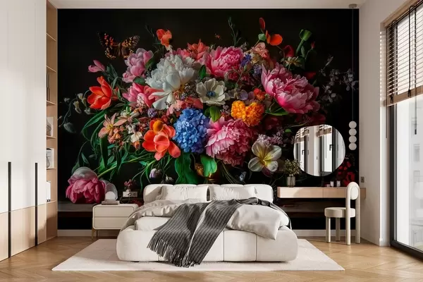 Zidne murale Buket u stilu nizozemskog uljanog slikarstva XVII stoljeća s luksuznom cvjetnom kompozicijom. br. w04078