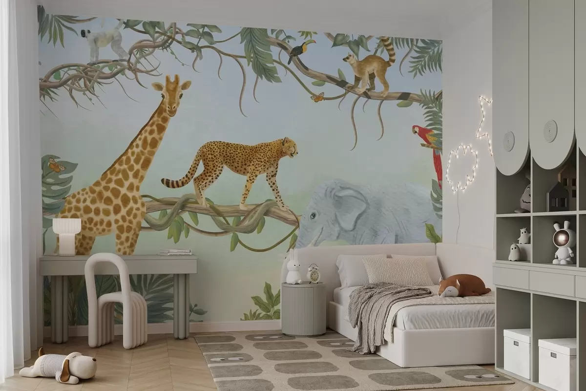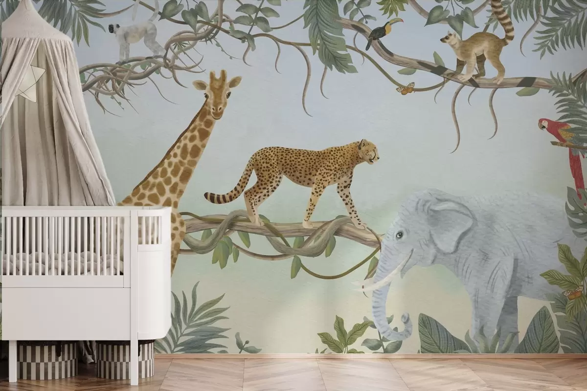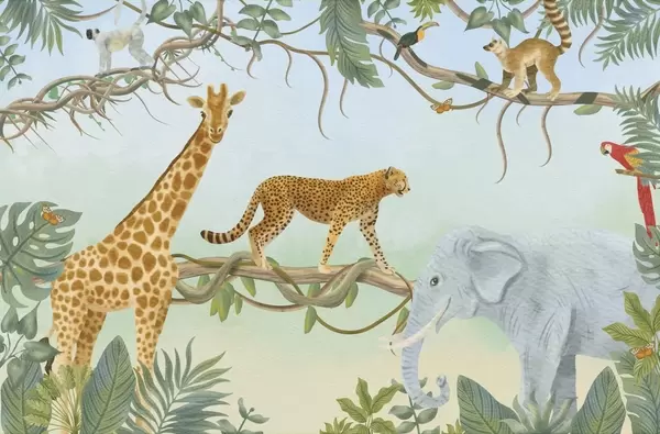Zidne murale Ilustracija džungle sa žirafom, gepardom i slonom br. w04194