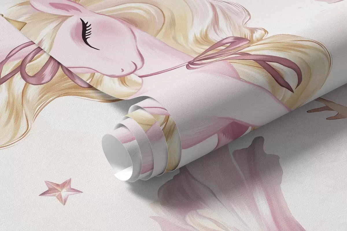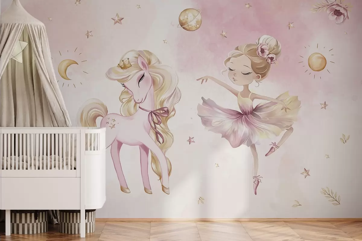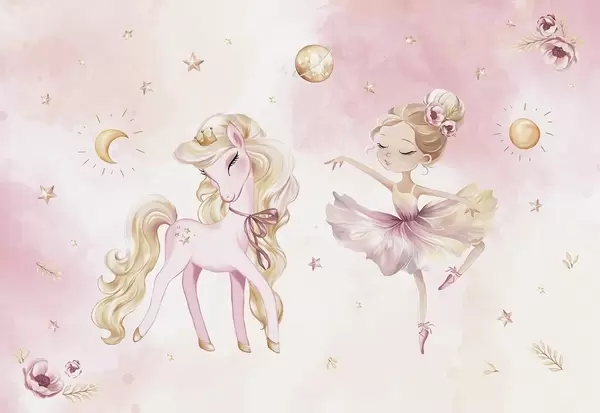 Zidne murale Jednorog i balerina u ružičastoj bajci, dječja priča br. w04196