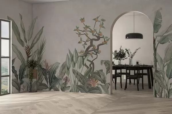 Zidne murale Tropska kompozicija s biljkama i drvećem na sivkastoj pozadini br. w04201v1