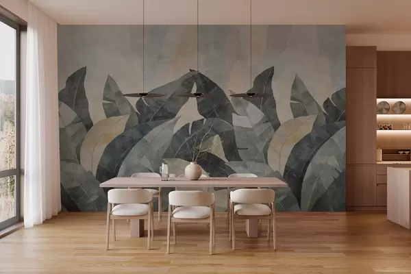 Zidne murale teksturirani listovi banane u prirodnim nijansama bež, zelene i sive br. w04285