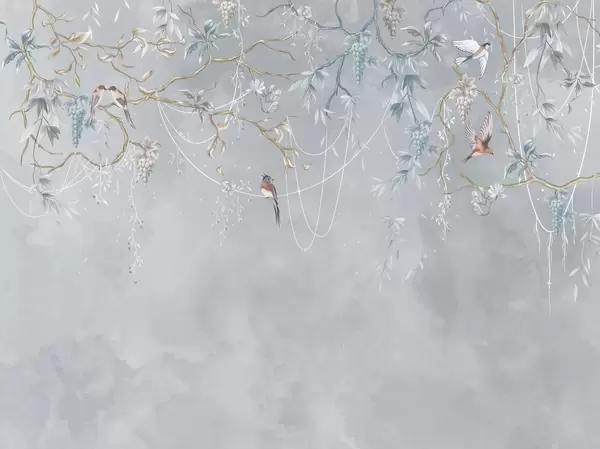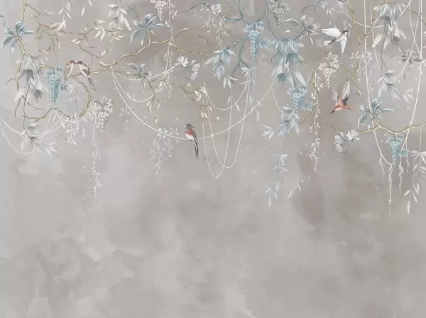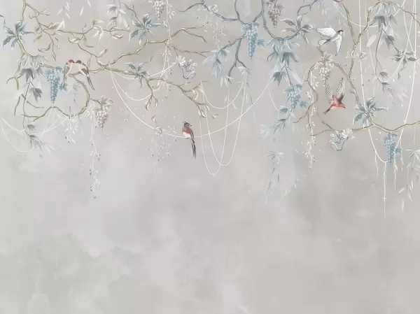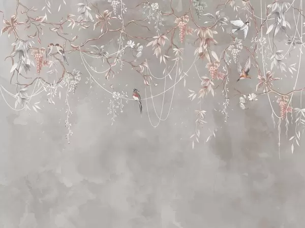 Zidne murale Grane s grožđem i pticama na toploj sivo-ružičastoj pozadini br. w04302