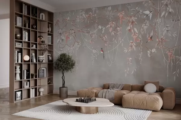 Zidne murale Grane s grožđem i pticama na toploj sivo-ružičastoj pozadini br. w04302
