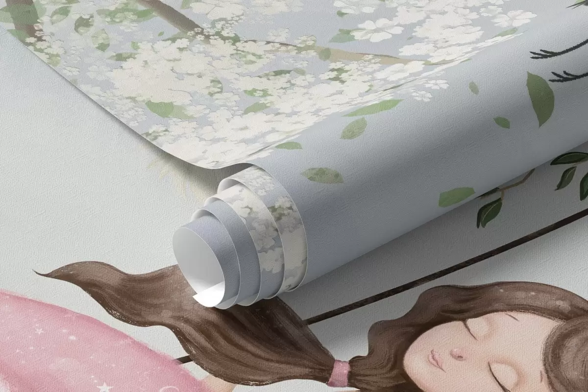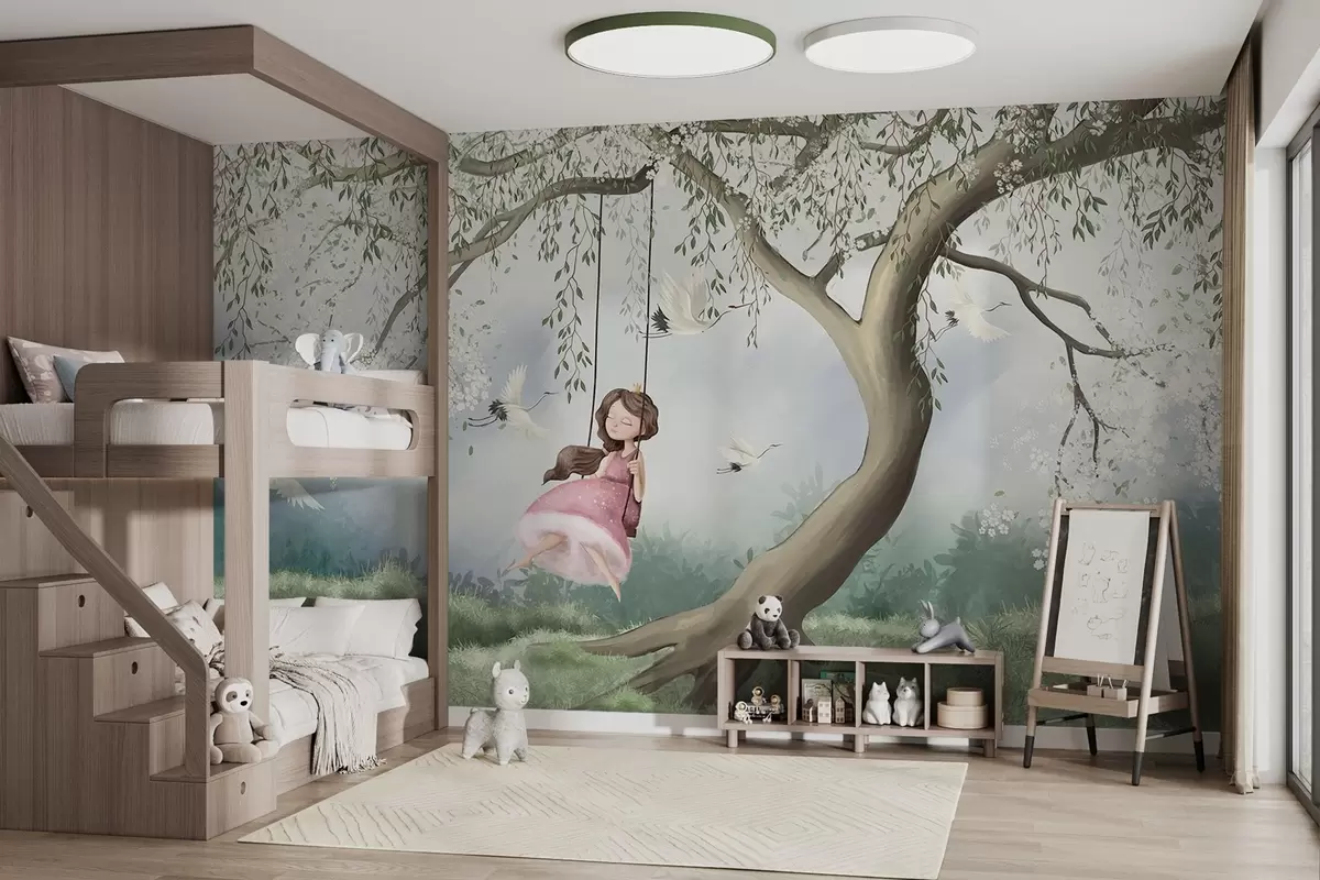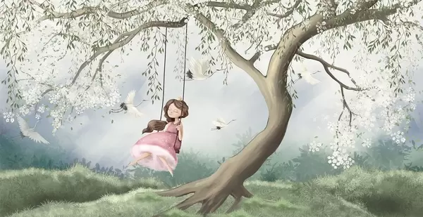 Zidne murale Djevojčica na ljuljački ispod cvjetajućeg drveta s pticama koje lete okolo br. w04370