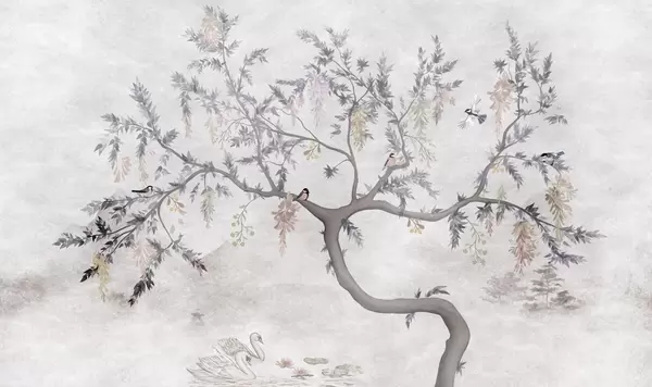 Zidne murale Grana drveta s pticama u orijentalnom stilu br. w04456