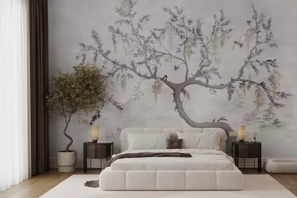 Zidne murale Grana drveta s pticama u orijentalnom stilu br. w04456