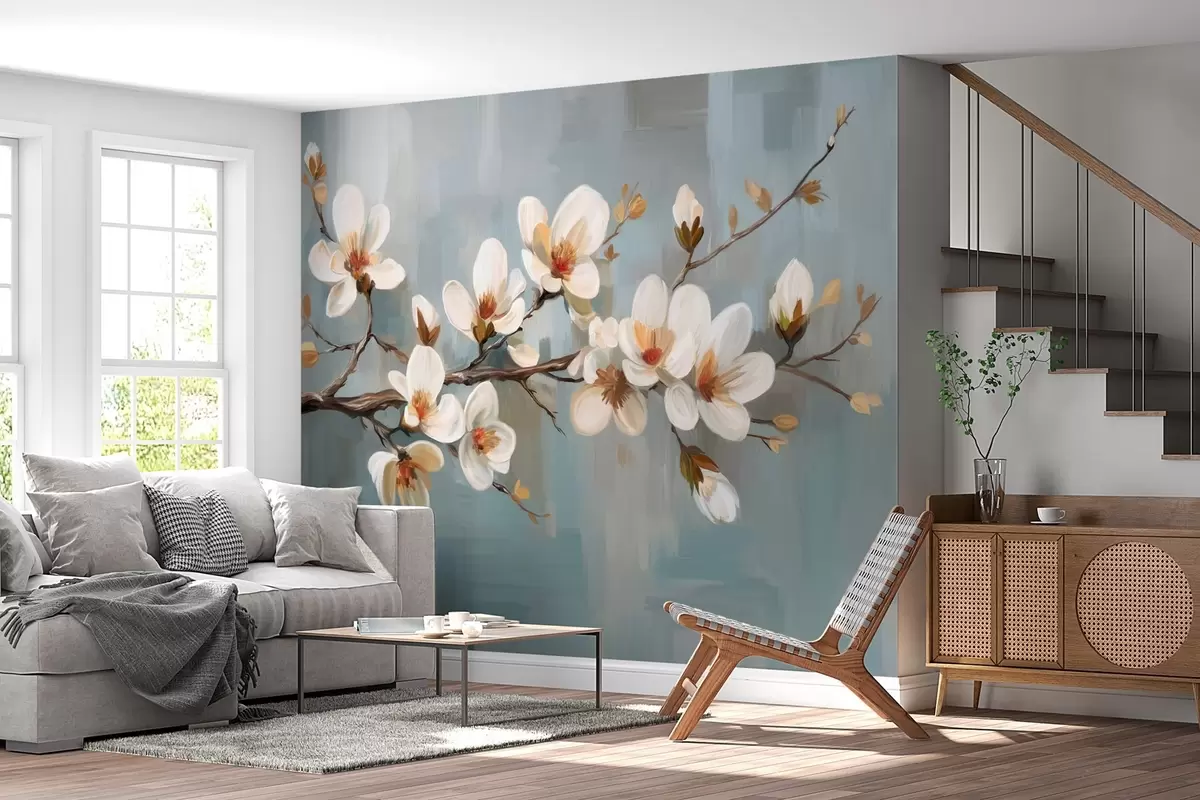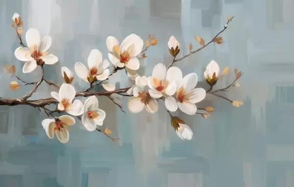 Zidne murale Cvjetajuća grana u stilu uljanog slikarstva na plavoj pozadini br. w04496