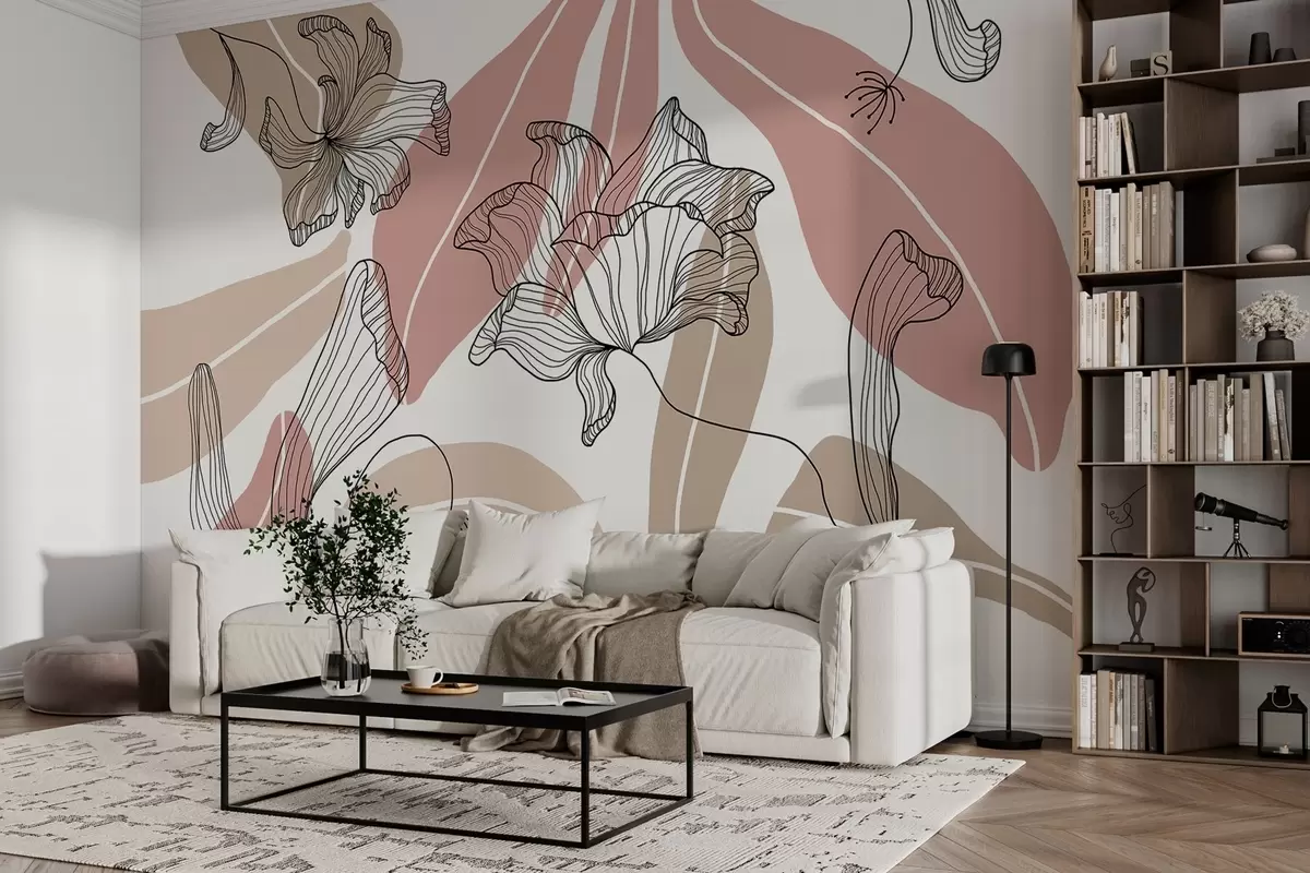 Zidne murale apstraktno lišće i cvijeće u puderastim i bež tonovima br. w04499
