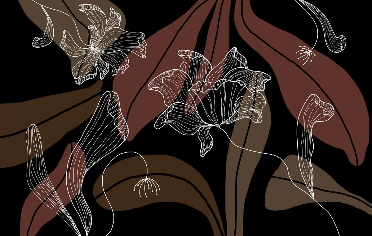 Zidne murale apstraktno lišće i cvijeće u puderastim i bež tonovima na tamnoj pozadini br. w04499v3
