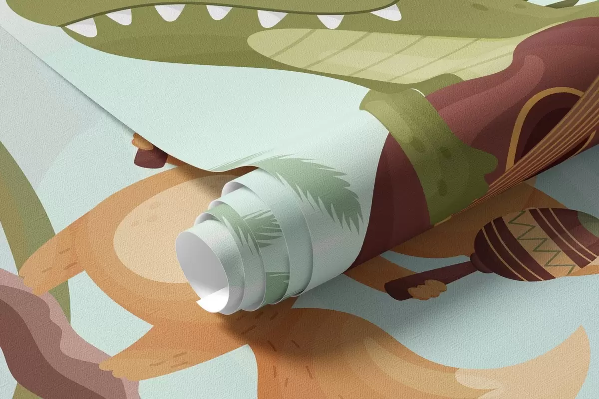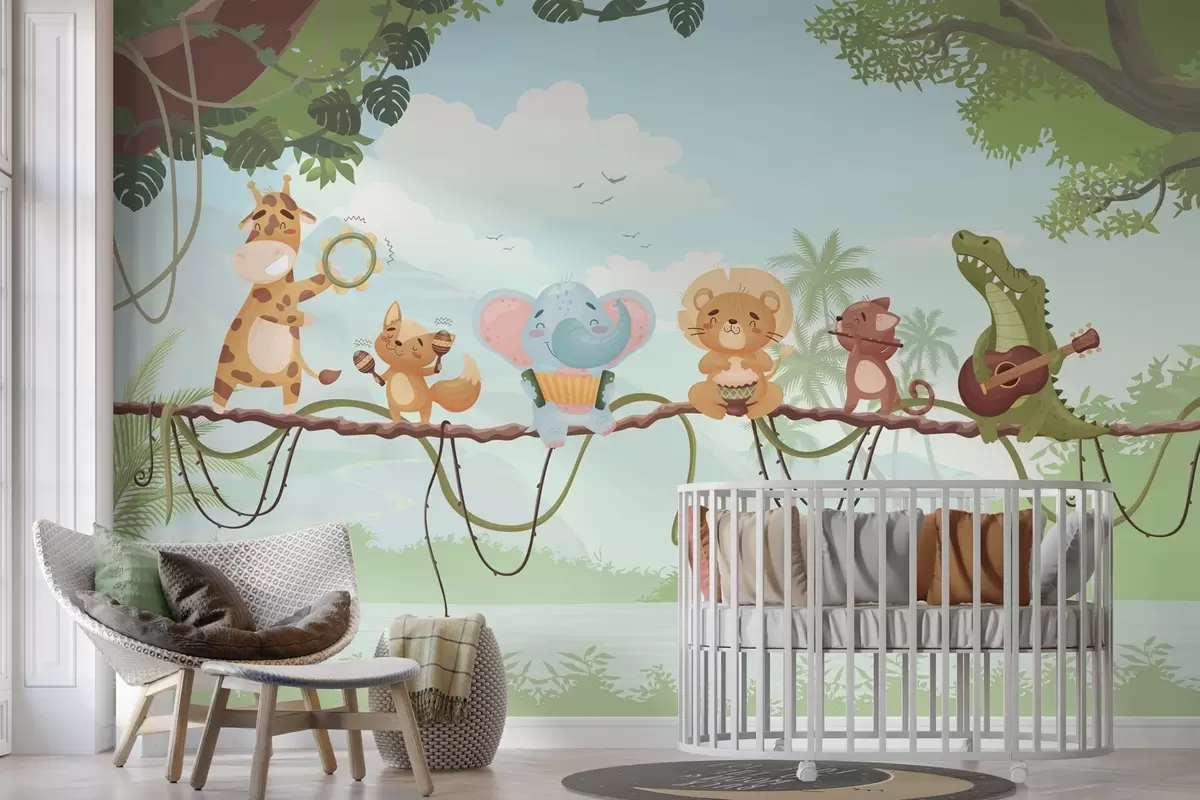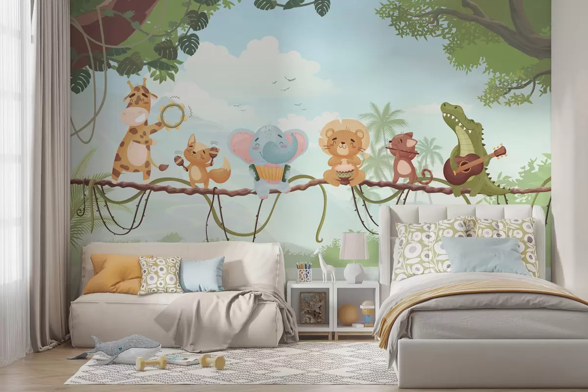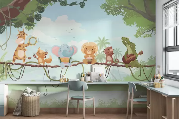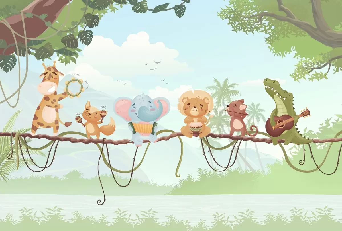 Zidne murale Životinje s glazbenim instrumentima naspram tropskog krajolika br. w04505