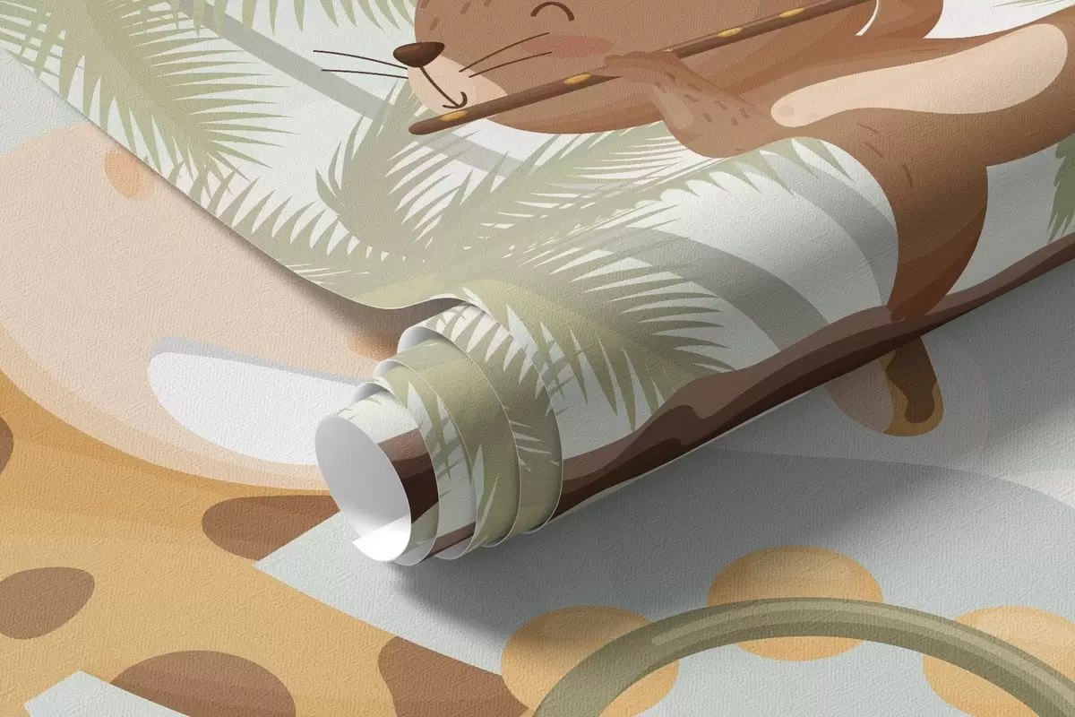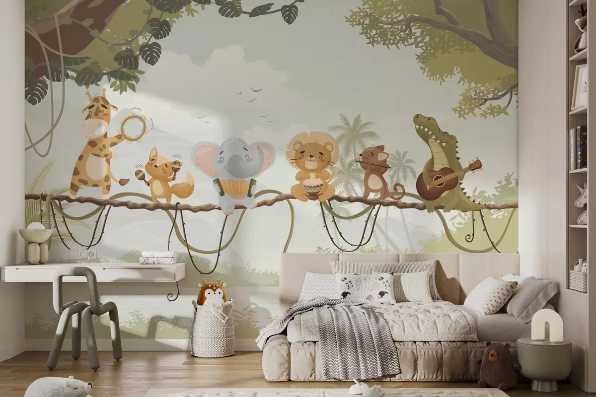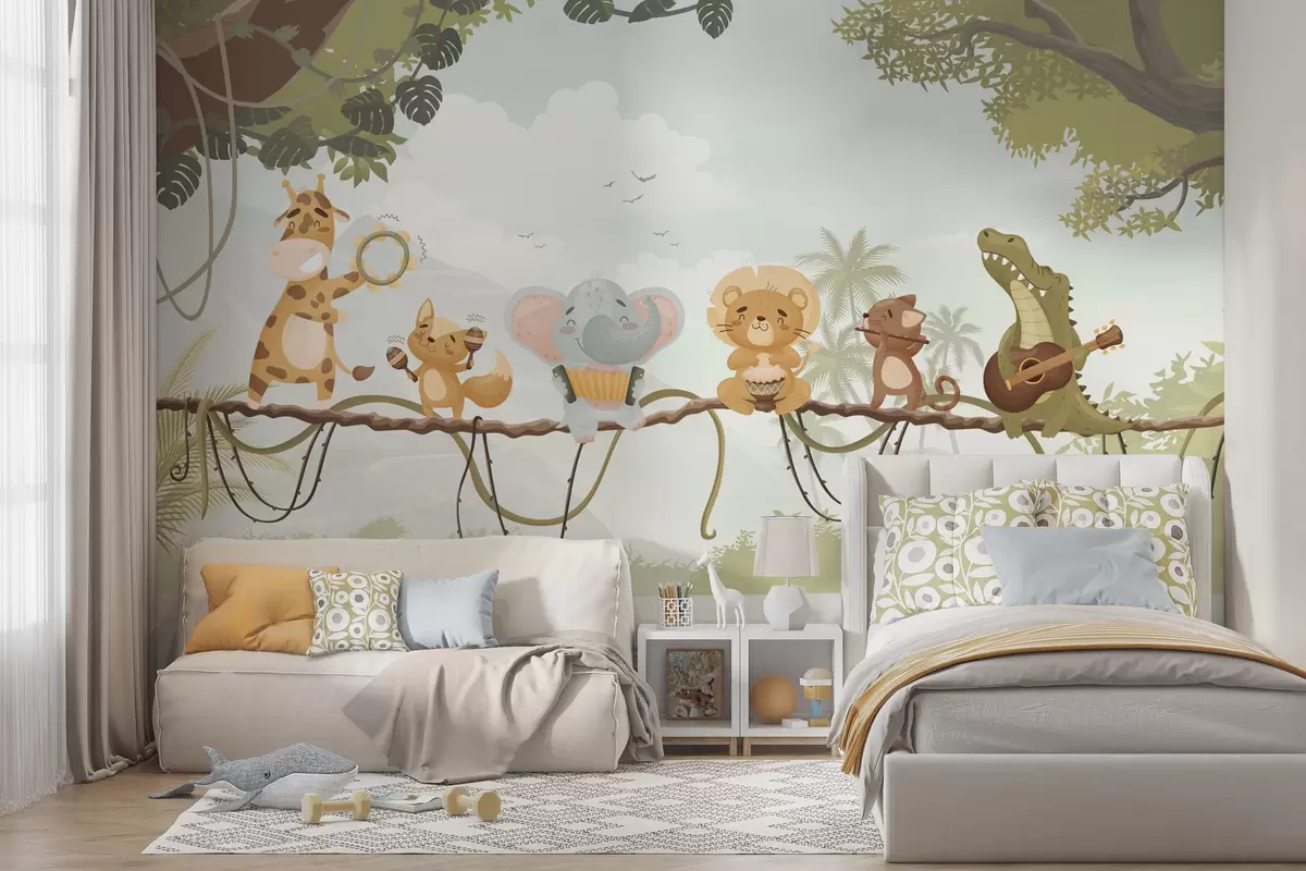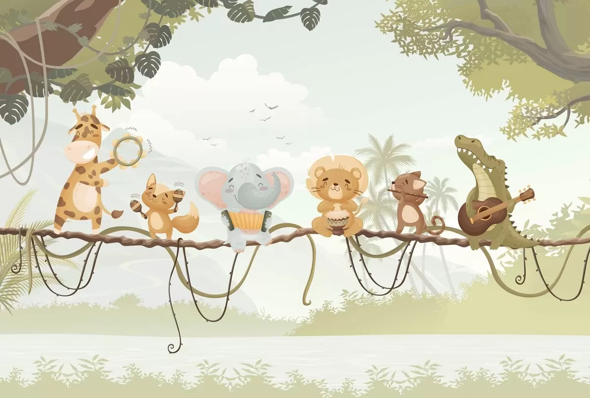 Zidne murale Životinje s glazbenim instrumentima naspram tropskog krajolika br. w04505v1
