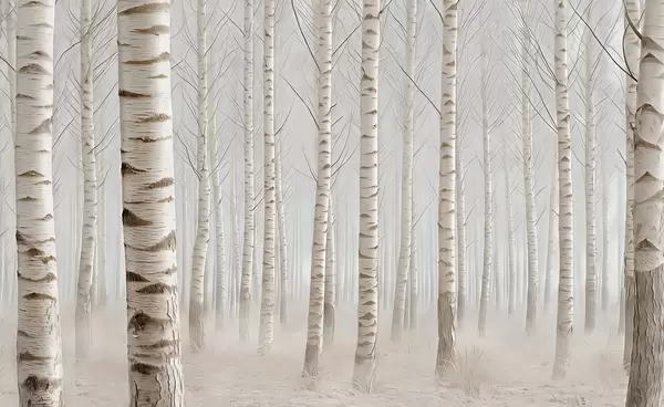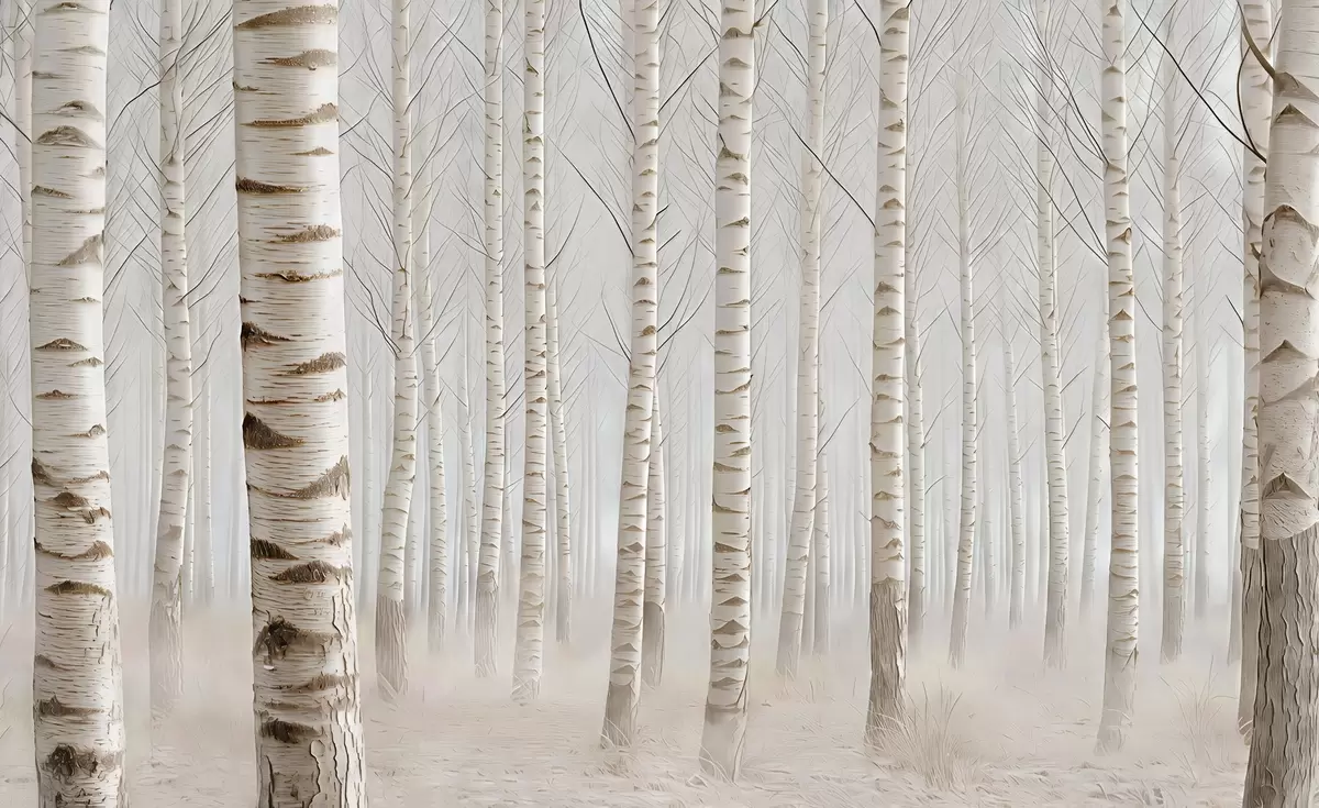 Zidne murale Brezova šuma u magli, lagani minimalizam br. w04574