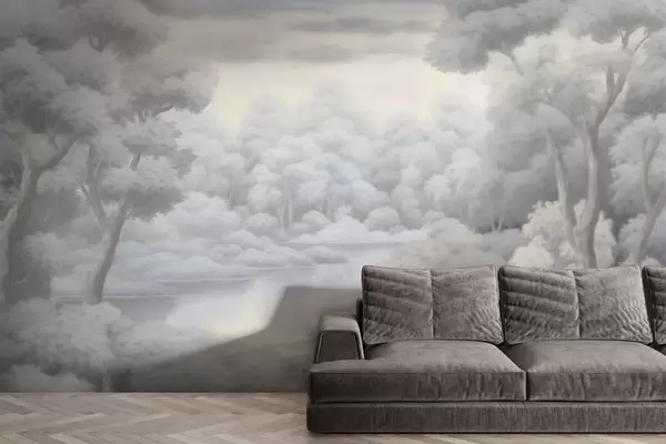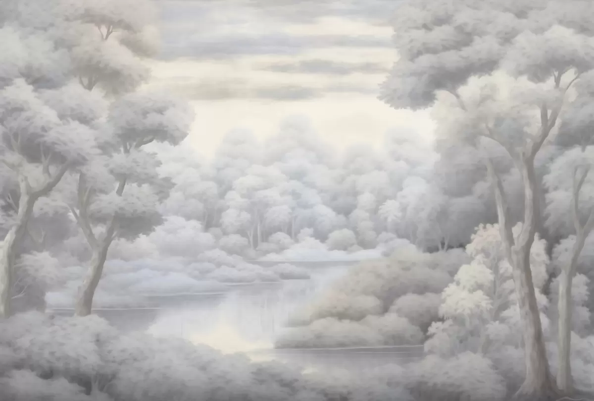 Zidne murale Maglovita šuma i jezero u mekim sivim tonovima br. w04617