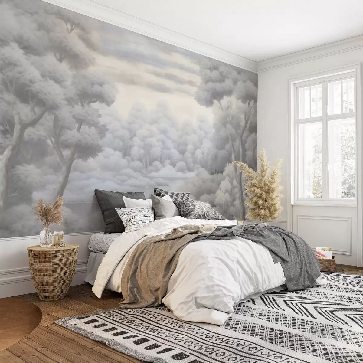 Zidne murale Maglovita šuma i jezero u mekim sivim tonovima br. w04617