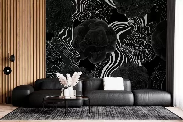 Zidne murale apstraktni organski oblici u 3D stilu u crnim tonovima s bijelim prugama br. w04628