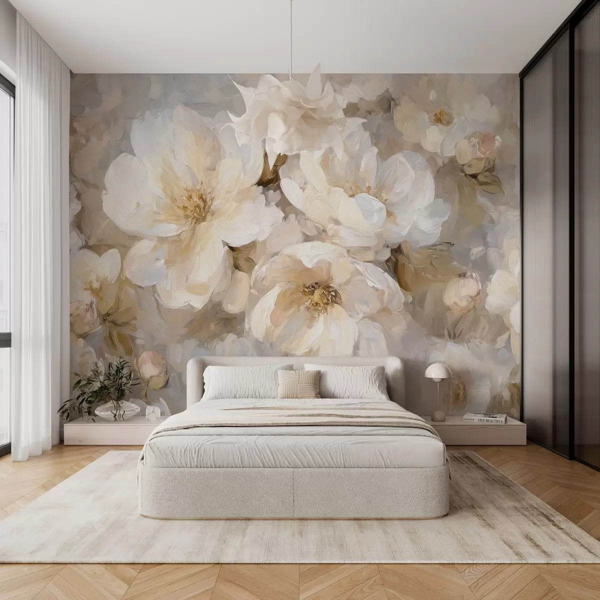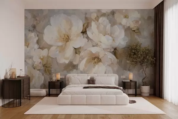 zidne murale veliko cvijeće u bijelim i bež tonovima u stilu uljanog slikarstva w04633