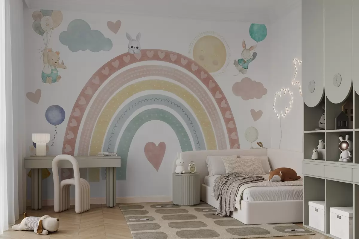 Zidne murale Pastelna duga sa srcima, životinjama i balonima br. w04681