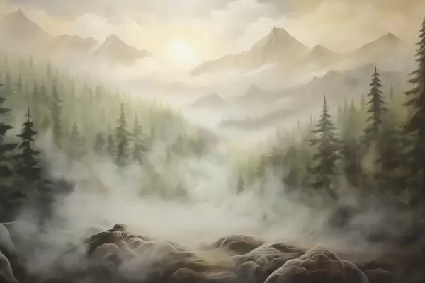 Zidne murale Šuma u magli na pozadini planina br. w04730
