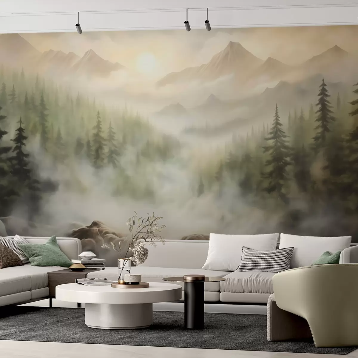 Zidne murale Šuma u magli na pozadini planina br. w04730