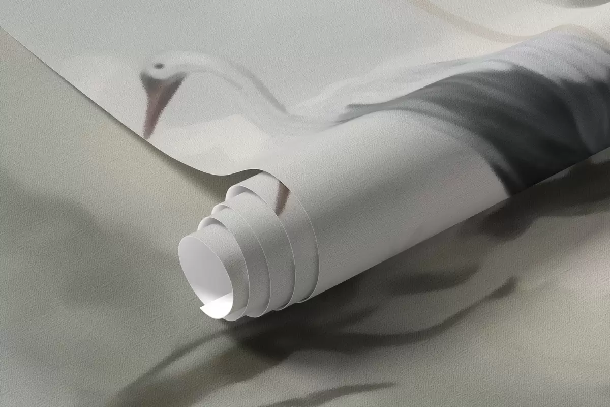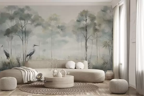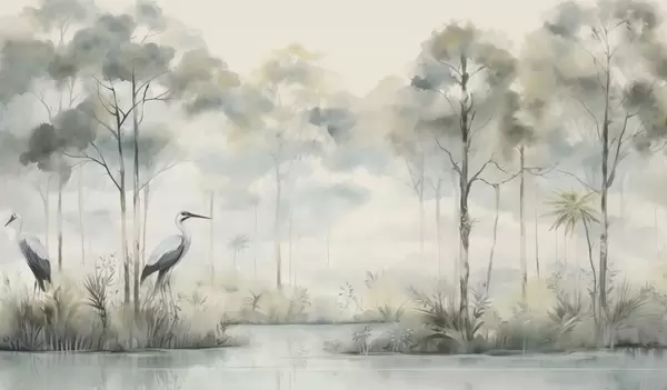 Zidne murale Maglovita šuma uz vodu s čapljama, meka hladna paleta br. w04788