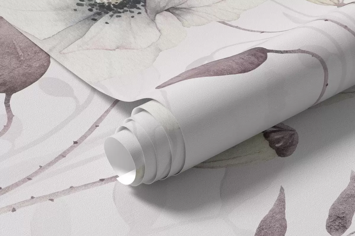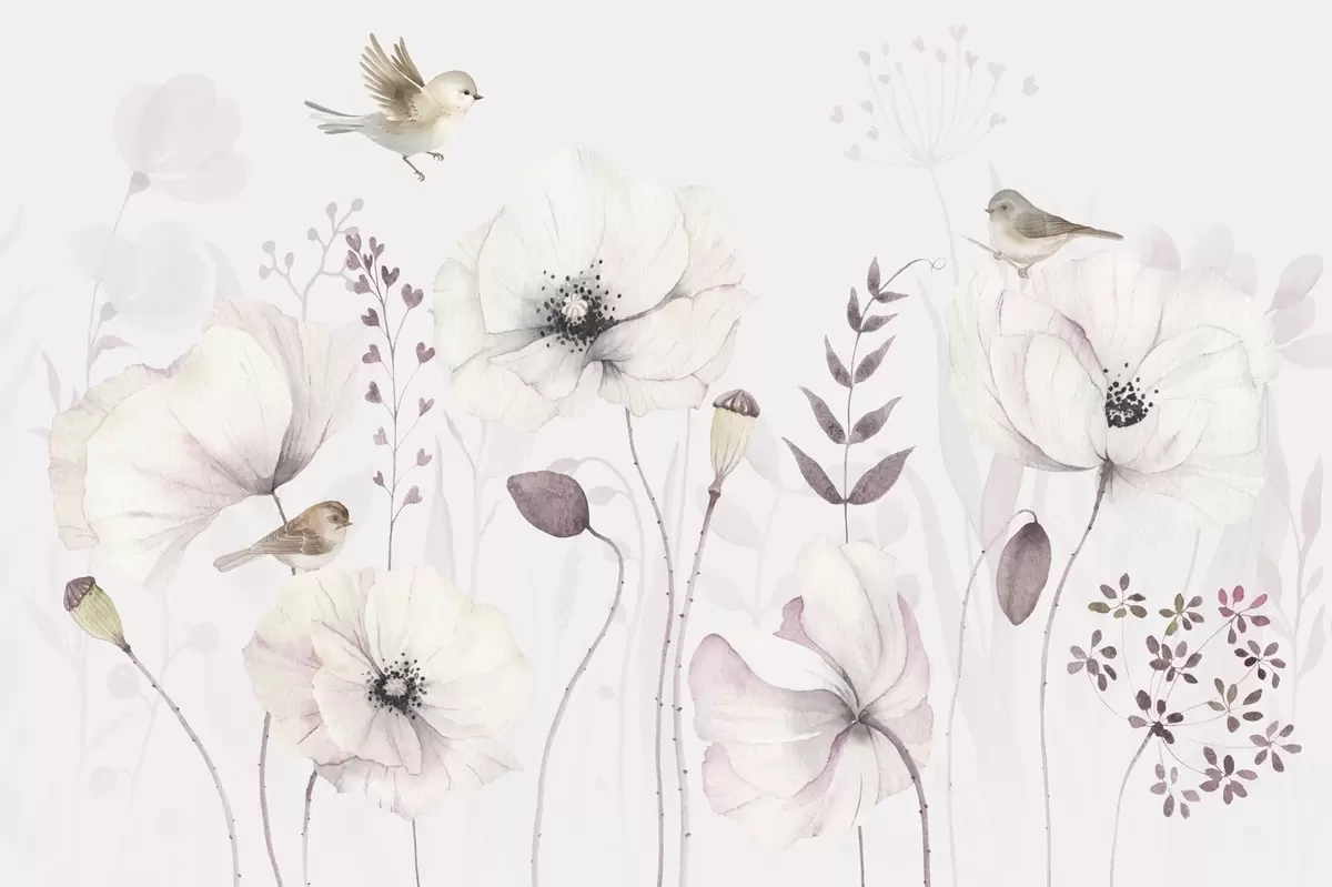 Zidne murale Akvarelni makovi s malim pticama u nježno ljubičastoj boji br. w04861