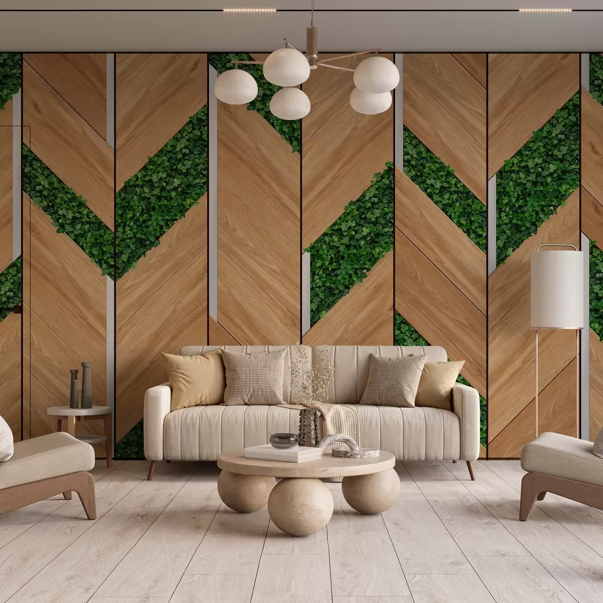 Zidne murale imitacija svijetlih drvenih panela s biljnim umetcima br. w04875