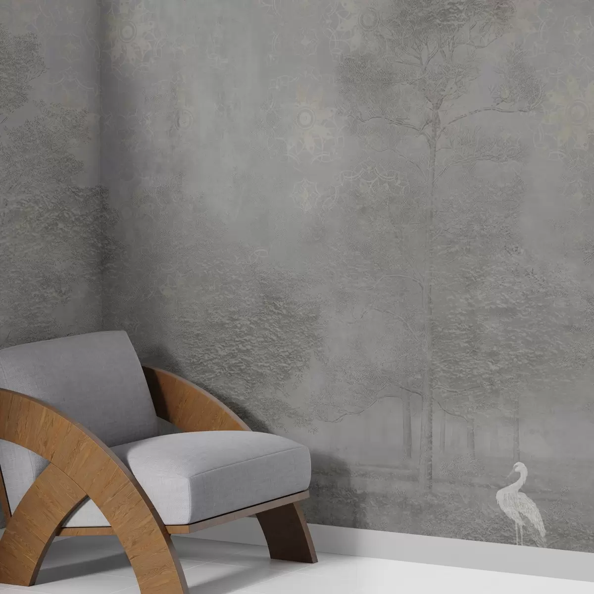 Zidne murale Svijetla maglovita šuma s čapljom u hladnim sivim tonovima br. w04953v2