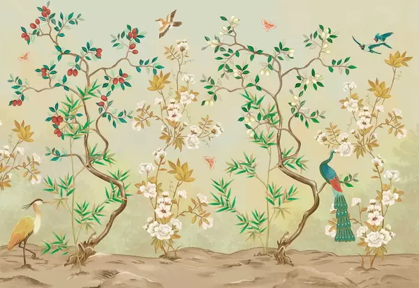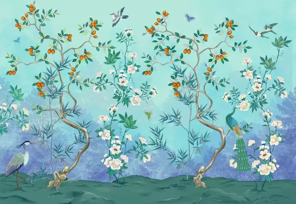 Zidne murale Dekorativni prizor s drvećem, cvijećem i pticama na tamnoj pozadini br. w05004