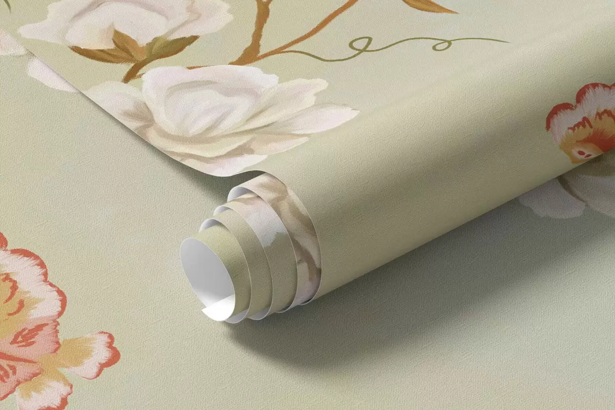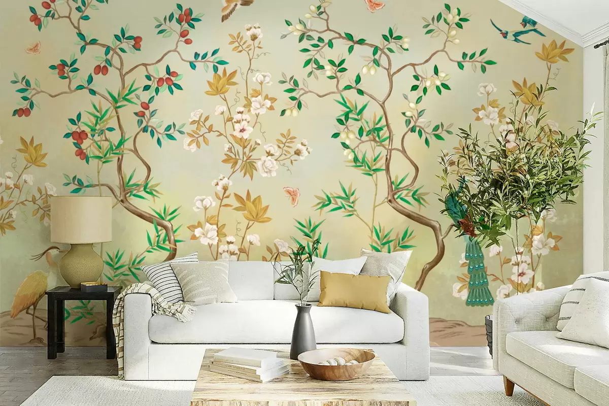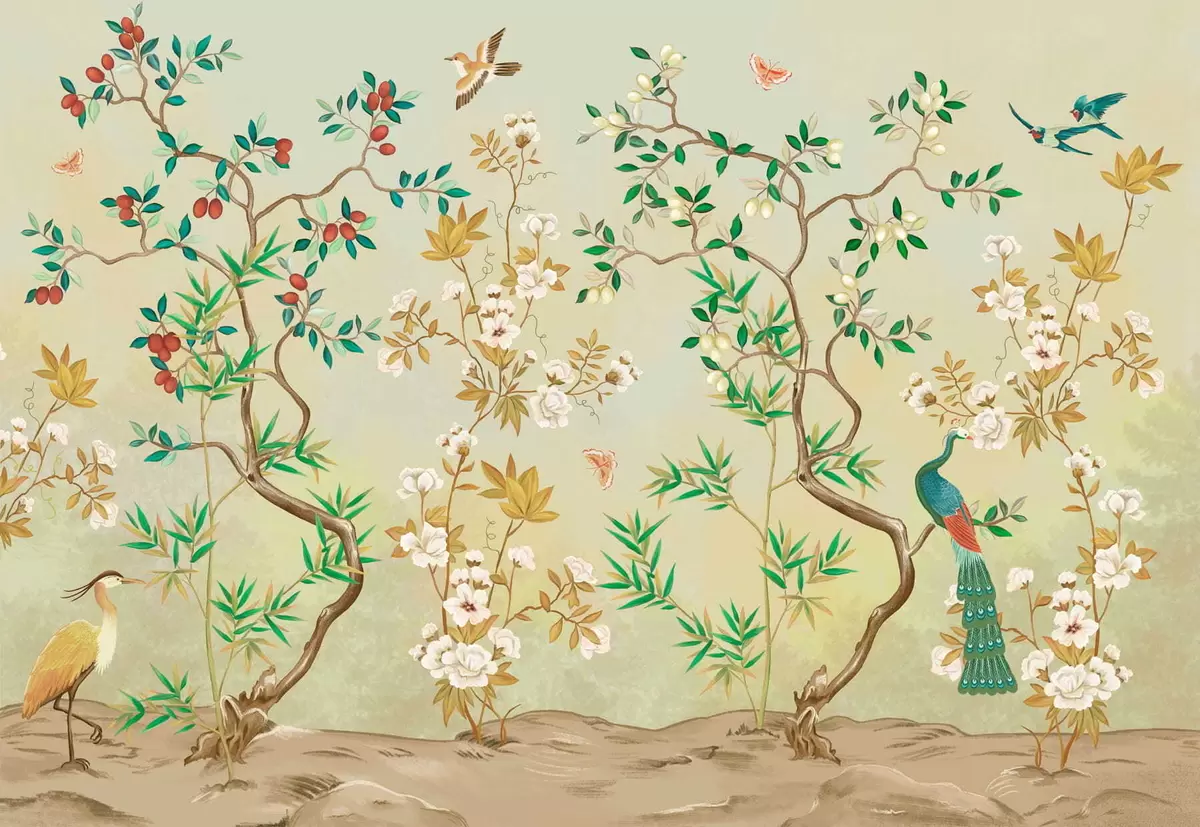 Zidne murale Prizor s drvećem, cvijećem i pticama, svijetla pozadina br. w05004v1
