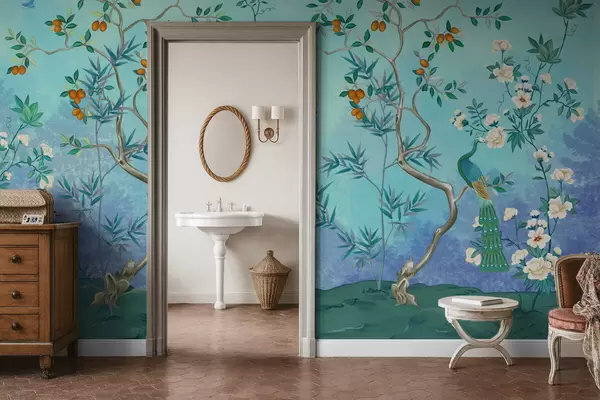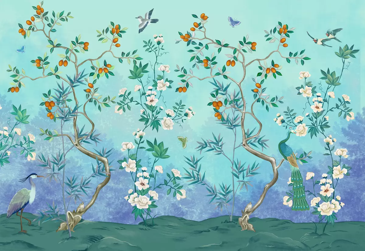 Zidne murale Prizor s drvećem, cvijećem i pticama, plava pozadina br. w05004v2
